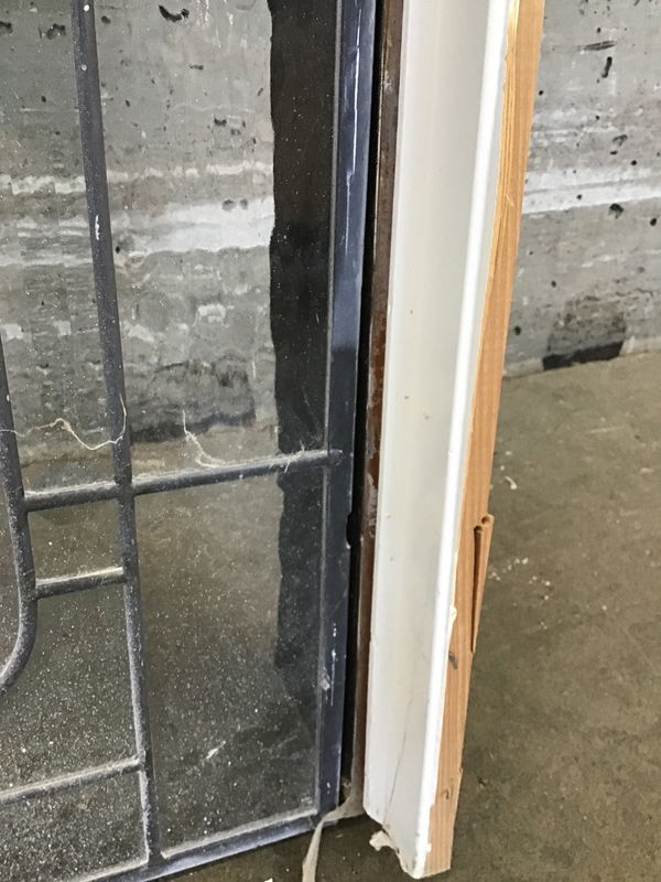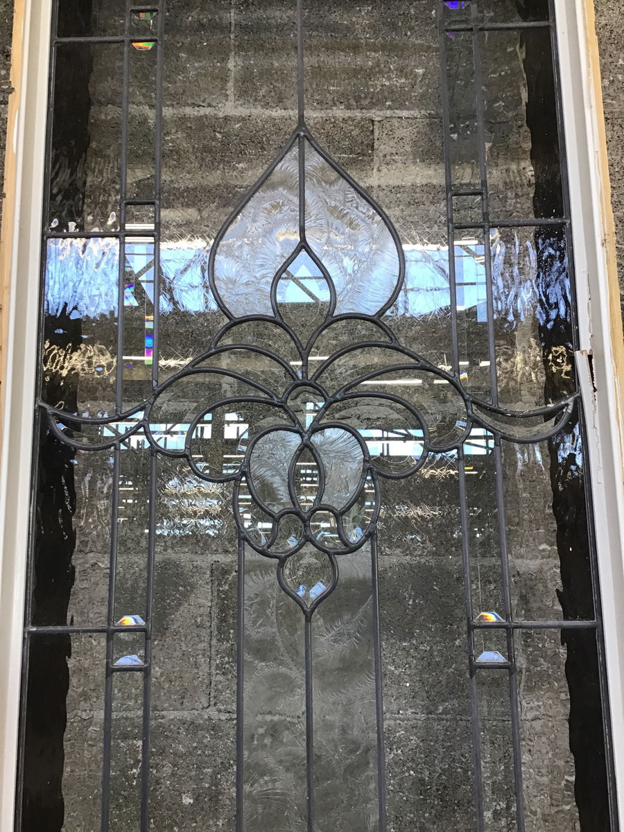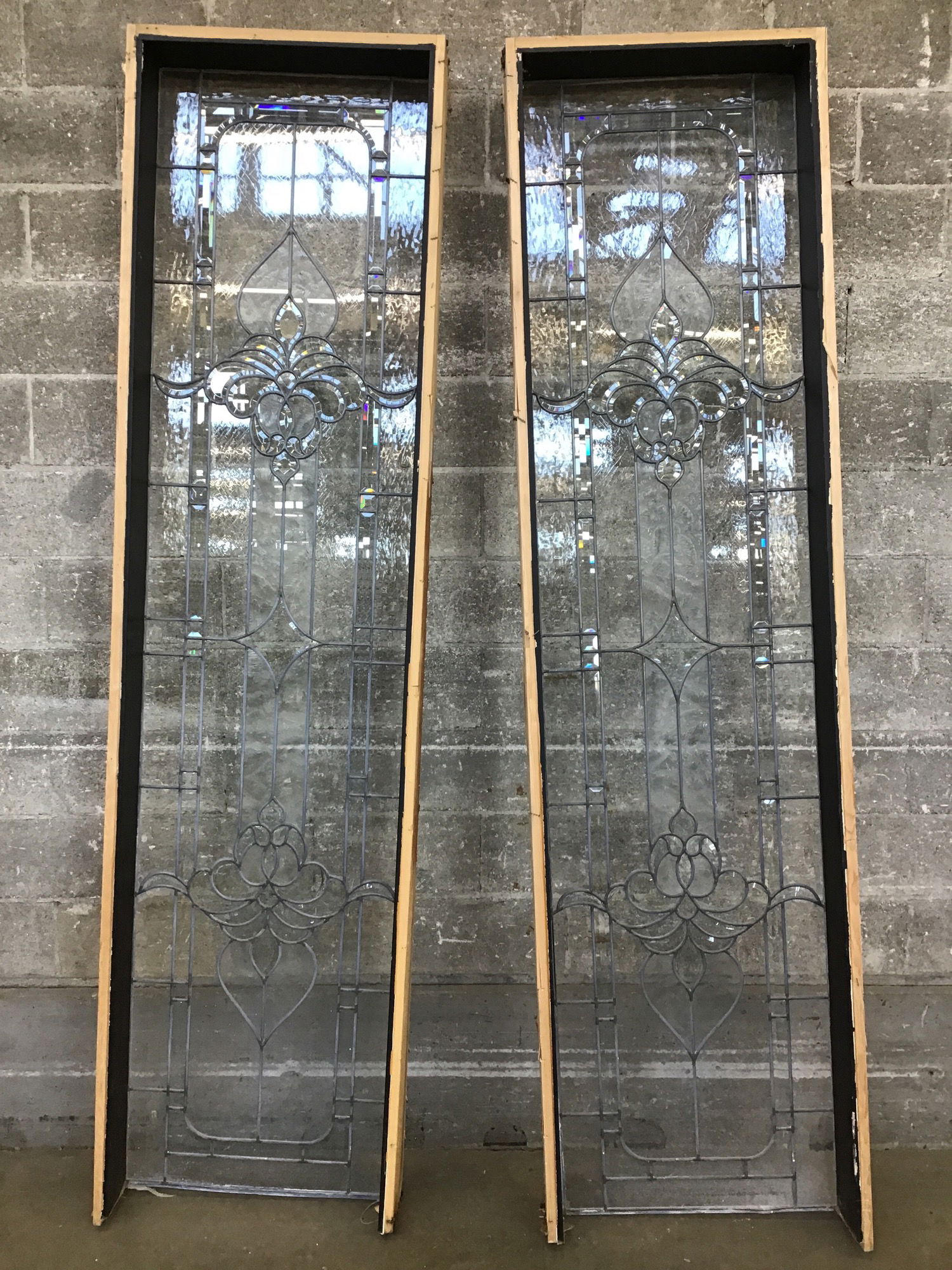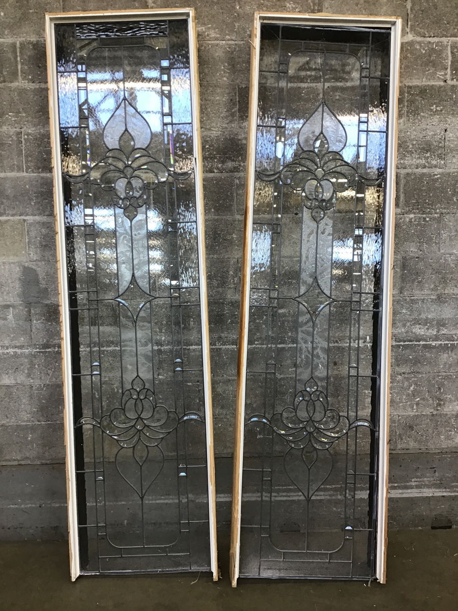 This pair of leaded, single pane sidelites features a luscious, vaguely floral design surrounded by frosted and beveled glass panes of all shapes and sizes. I only see two cracked lites between them, but both frames took some damage on one of the short sides when removed and will need a replacement for that part of the frame.