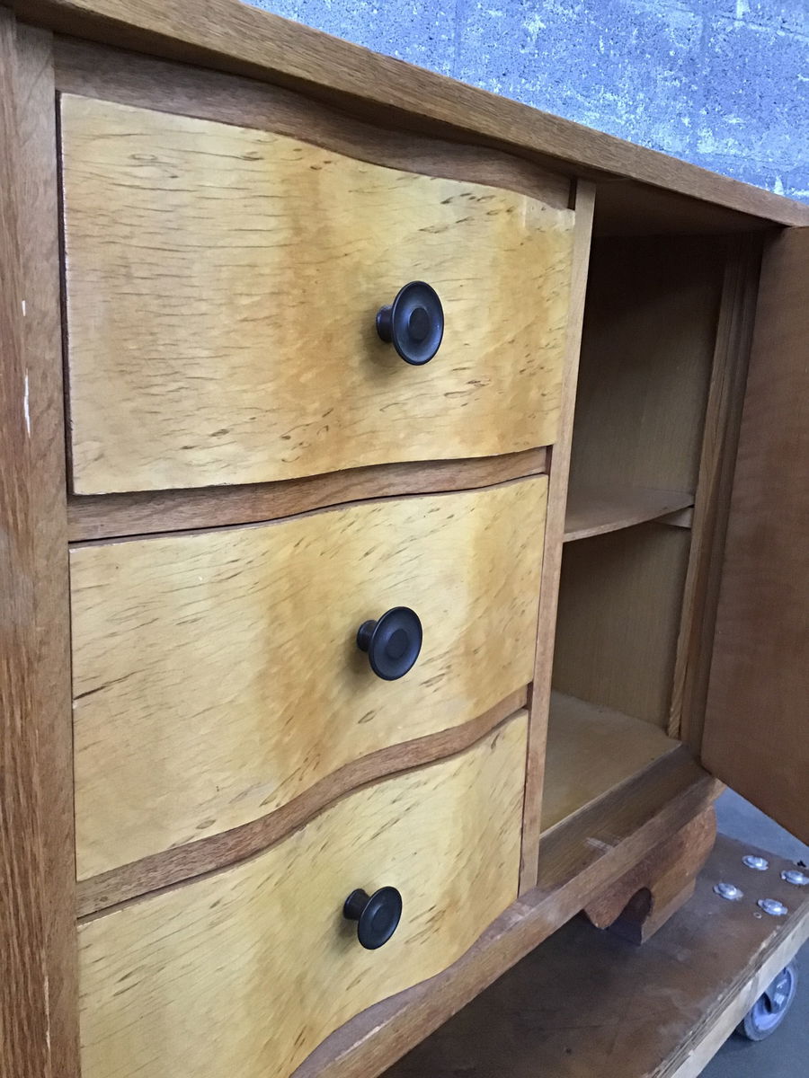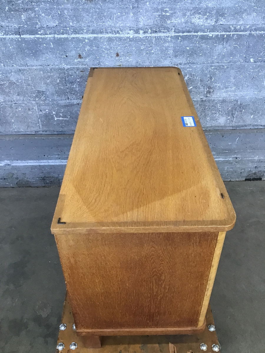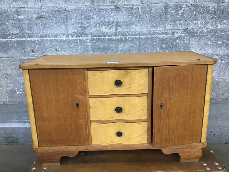 This is a vintage wooden dresser whose top and door faces are made from what I believe to be ash with figured maple drawer faces and corner trim. There are 3 curvy drawers and two doors, one of which is locked, and unfortunately we have no key. Luckily, the backing board is easily popped off and you could either remove the hardware or maybe dig through our collection of keys in the cashier room to possibly find "the one".