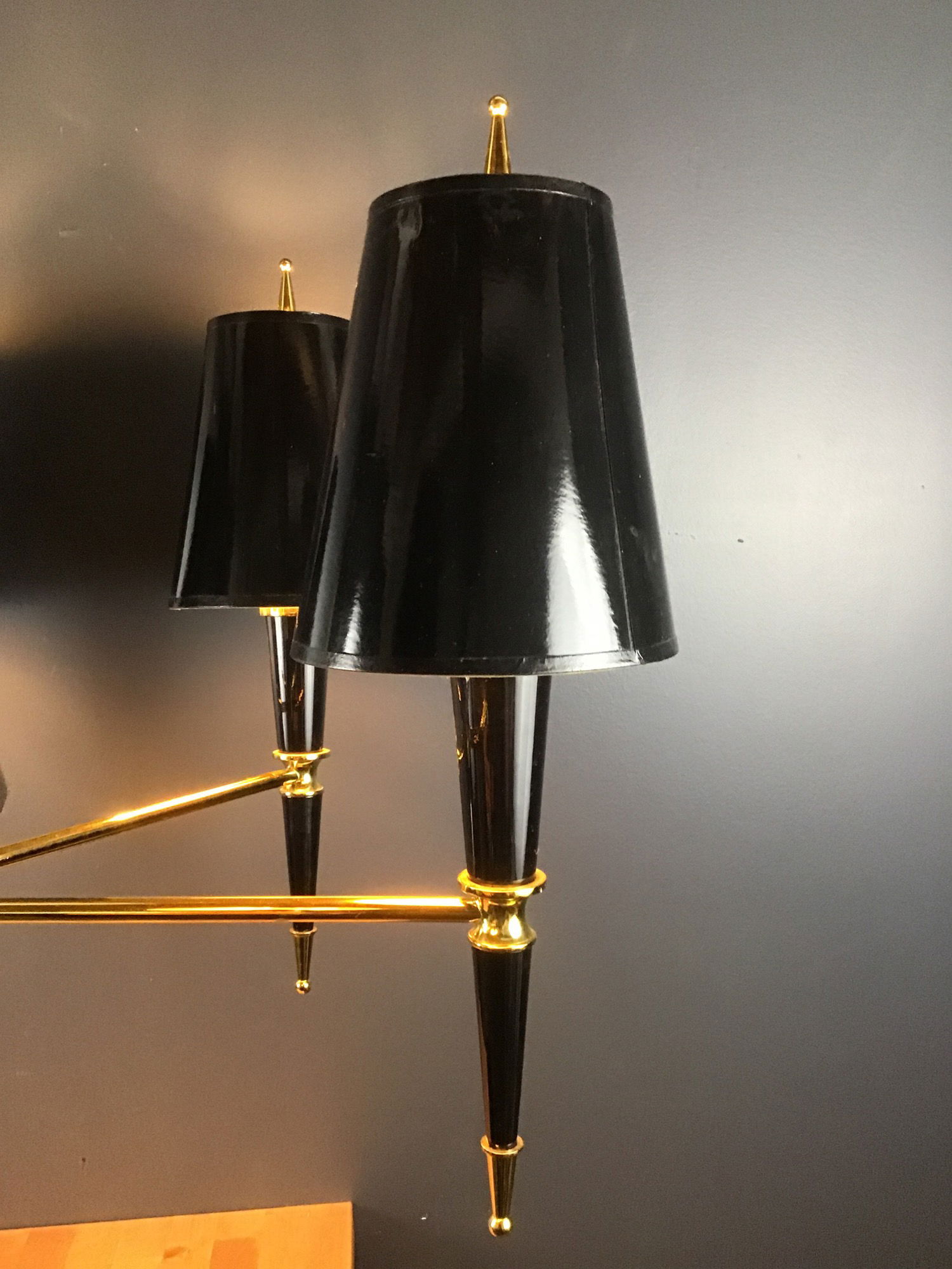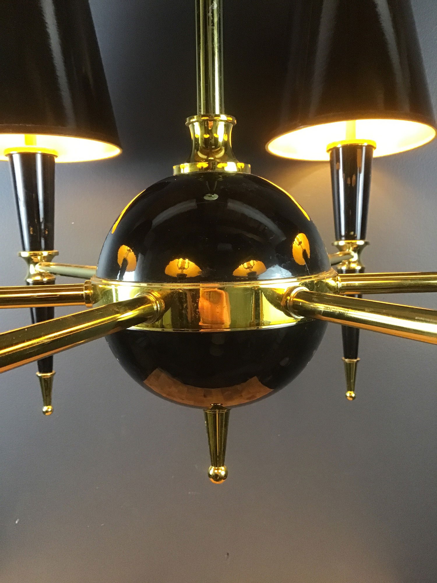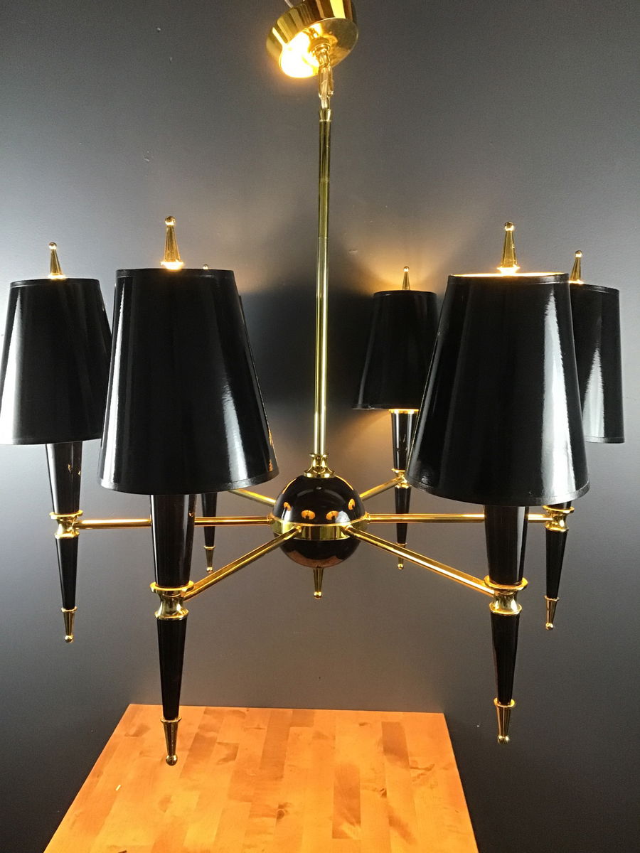 Neoclassical-inspired show stopper boasts black lacquered shades, powder-coated body, and brass accents. Price reflects minor cosmetic damage on shades.