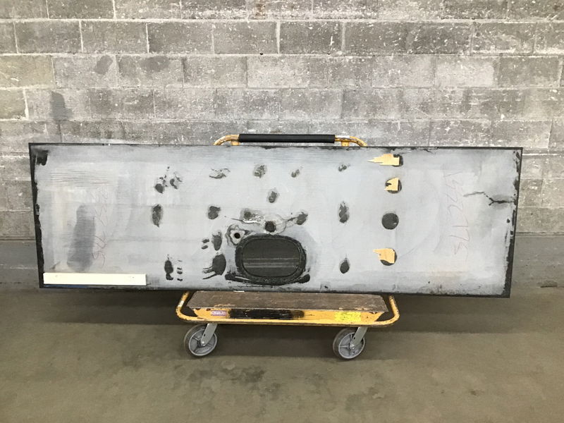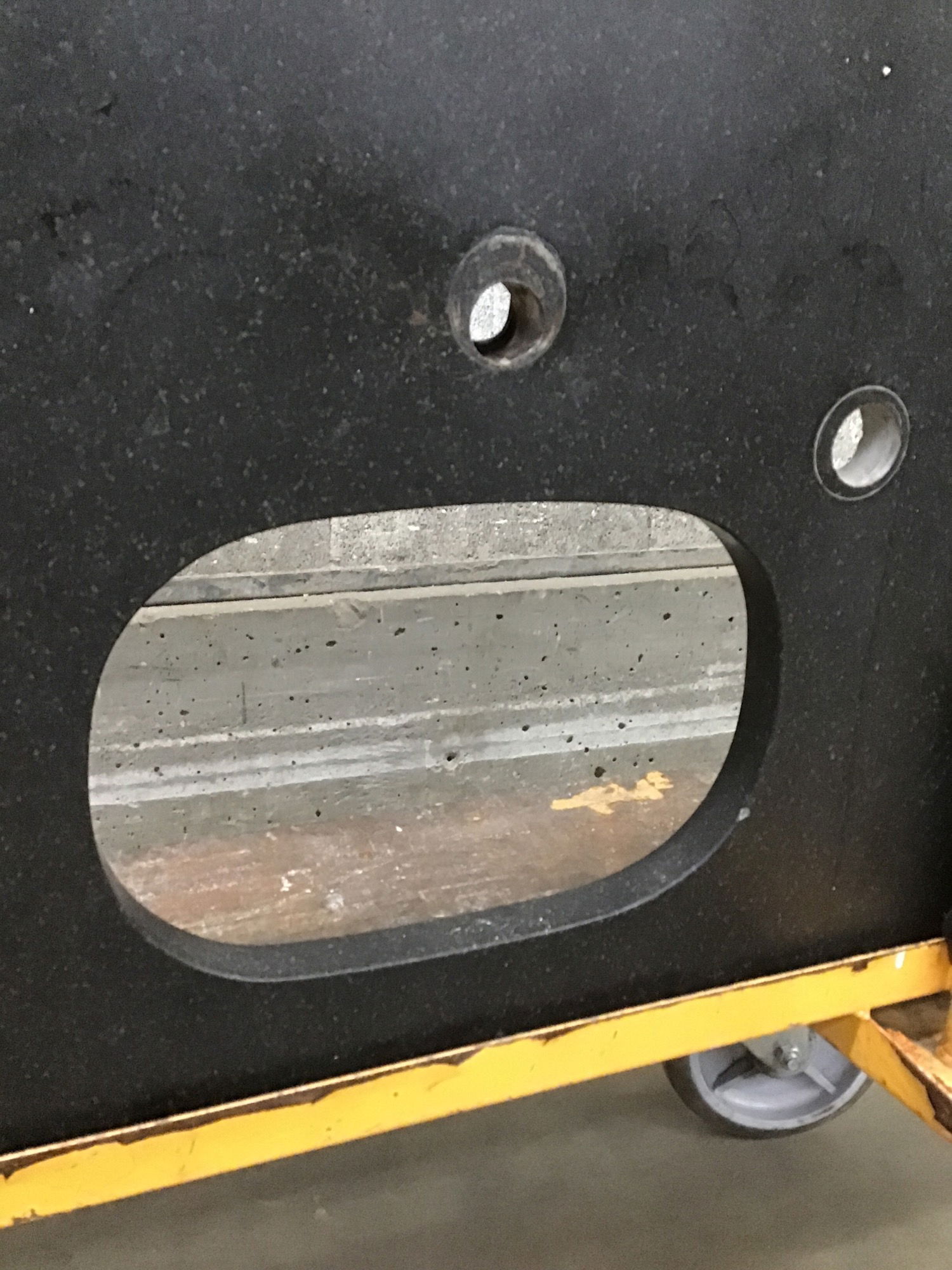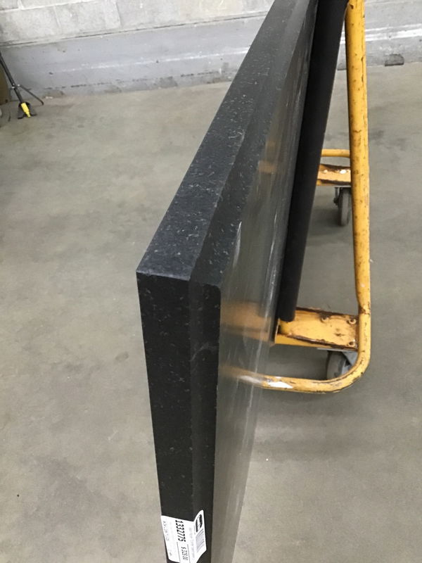 Nearly black piece of stone with some lighter flecks here and there (sort of the look of black pepper). I believe it's granite, but I'm not a stone expert. All sides are finished for use as an island top. Has a 13 1/4" x 9" cutout with finished edges for an undermount sink (see item #1332781). From top finished front edge in photo to single faucet hole is 18"; 21 1/2" to start of sink cut out.