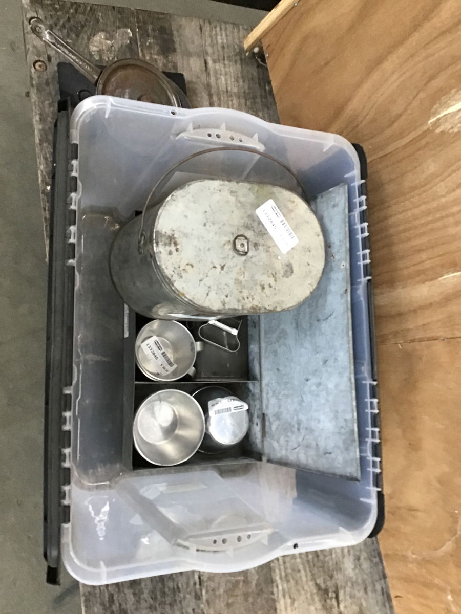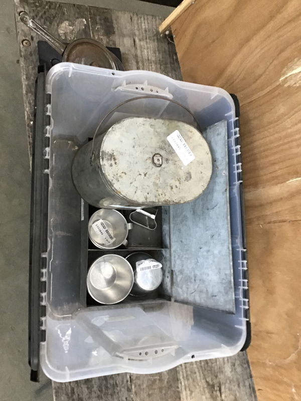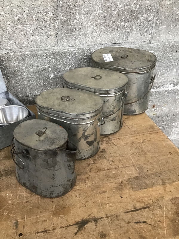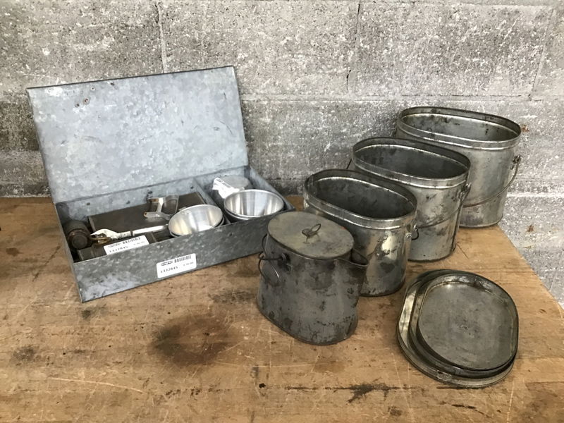 Multiple pieces of camp cooking and eating utensils. There are three oval tin containers that nest inside one another and the smallest piece is a coffee pot. There's also a tin box with some other camp cookery items and some Wear Ever brand aluminum coffee cups.