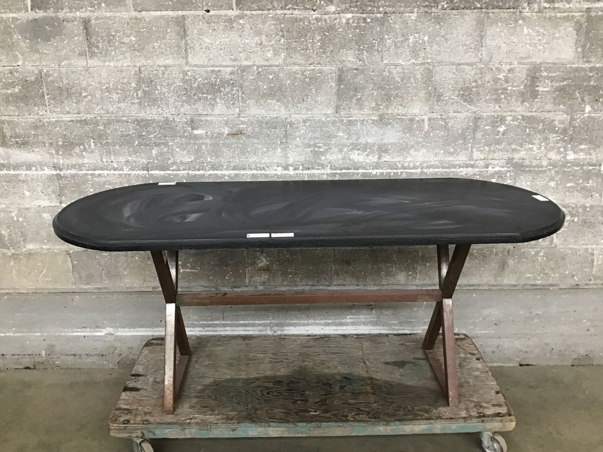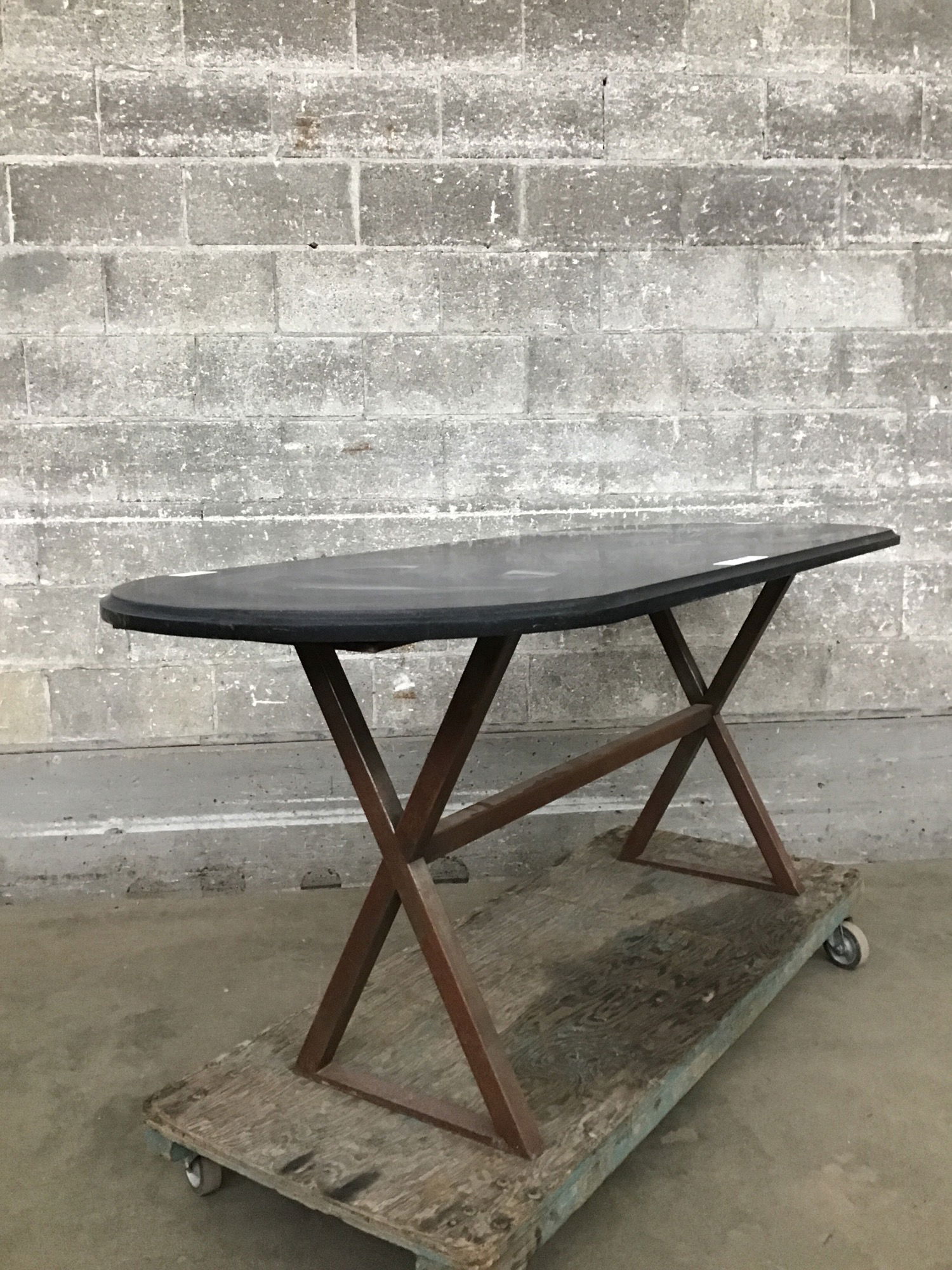 Previously used as an outdoor dining table, this beast features a criss-crossing steel base with a killer patina and a HEAVY ?granite? top. Tho this is well suited to life outside, you could certainly repurpose it as an indoor dining table. I mean, why limit yourself? Or this table?