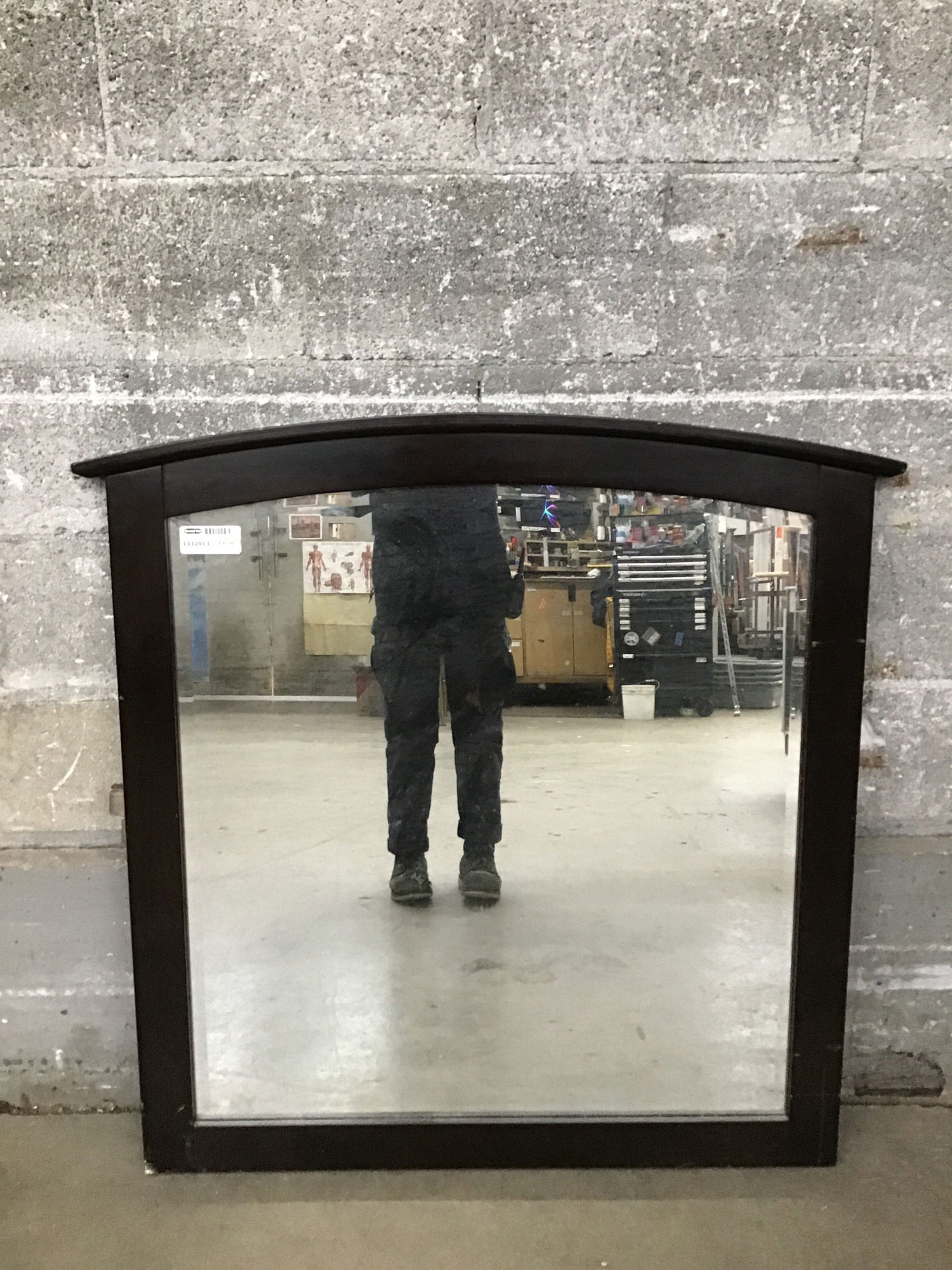 Arch top mirror in a dark stained finish. This was previously paired with a dresser and has rails on the back in case you'd like to mount it to another.