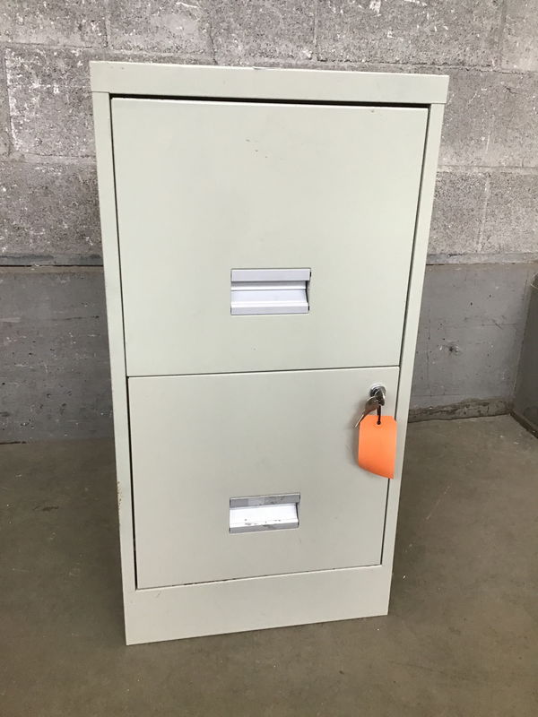 A little file cabinet with two drawers and a lock which functions- key included!