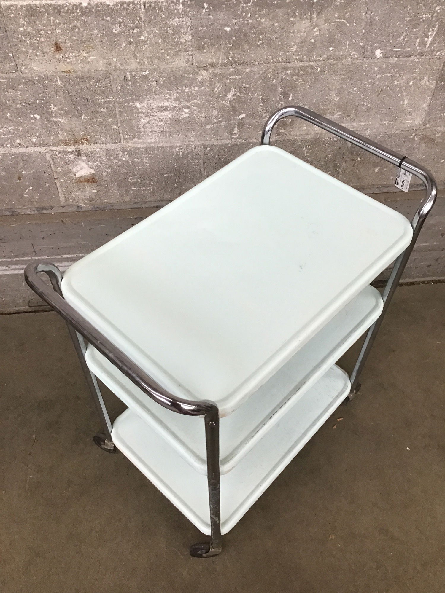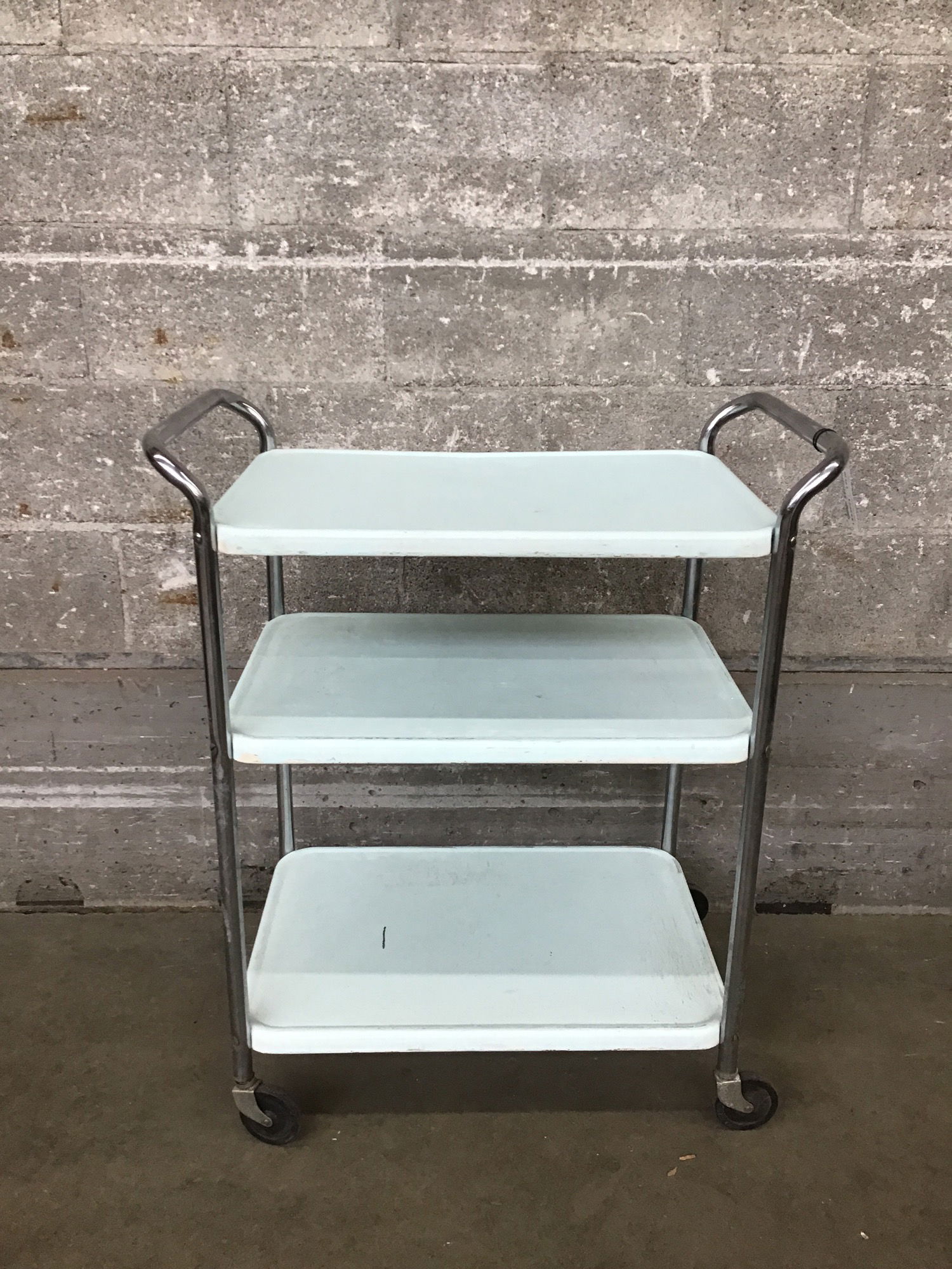 These little Cosco kitchen carts are a midcentury icon for a reason! Just the perfect balance of sleekness and charm. This one has a more recent minty-fresh paint job. It's in pretty good shape, though the casters could use a little lubin' if you plan to wheel it around.