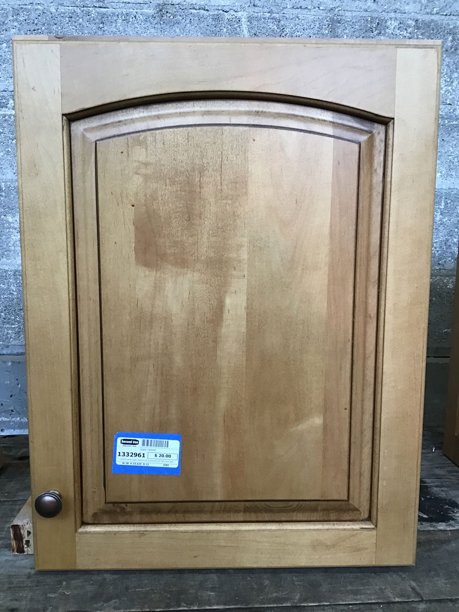 Arched panel upper cabinet with a plywood box. Will need new shelves inside, but the box and face are in good shape.