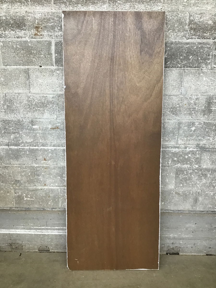 A hollow-core closet door with a mahogany veneer that's been painted white on the exterior side.