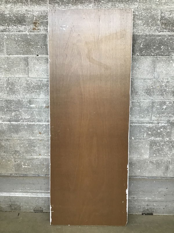 A hollow-core closet door with a mahogany veneer that's been painted white on the exterior side.