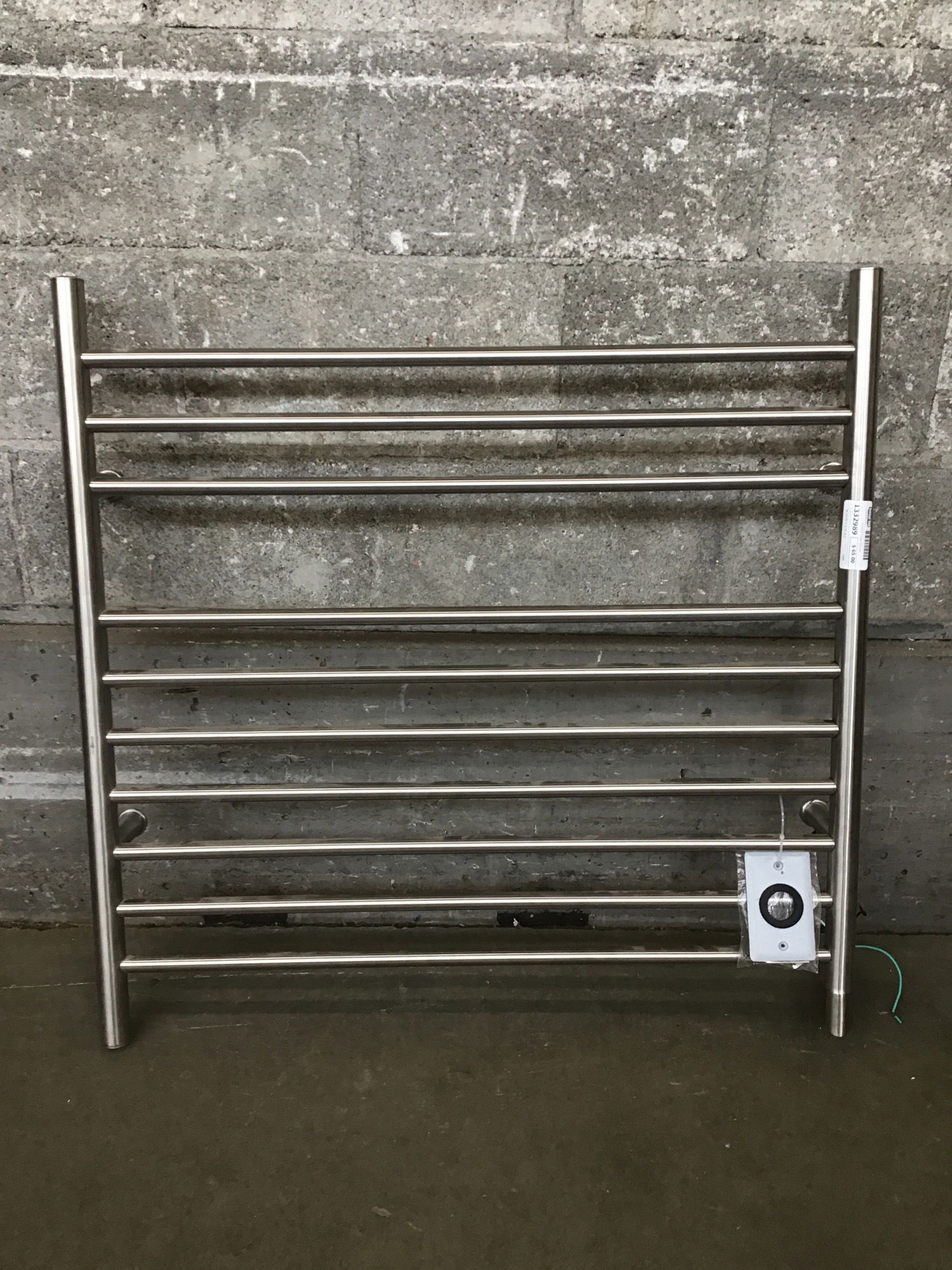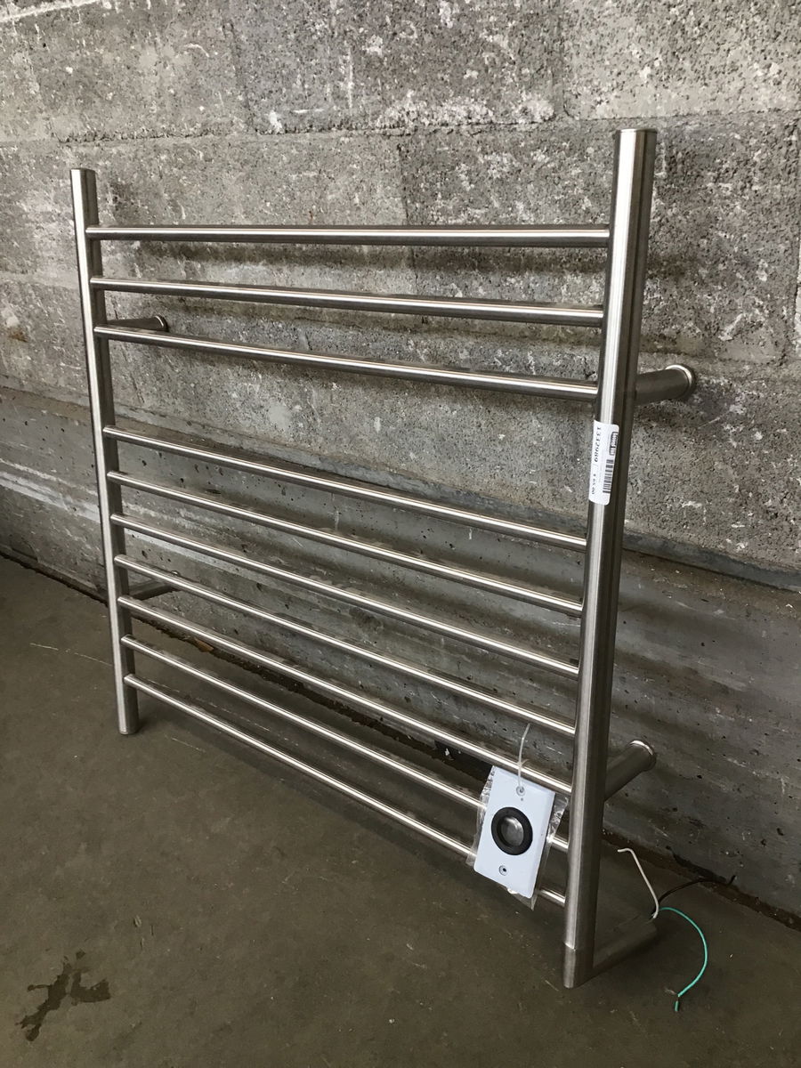 An electric 120V towel warmer with a brushed stainless steel finish that appears to be in good condition. Sold untested.