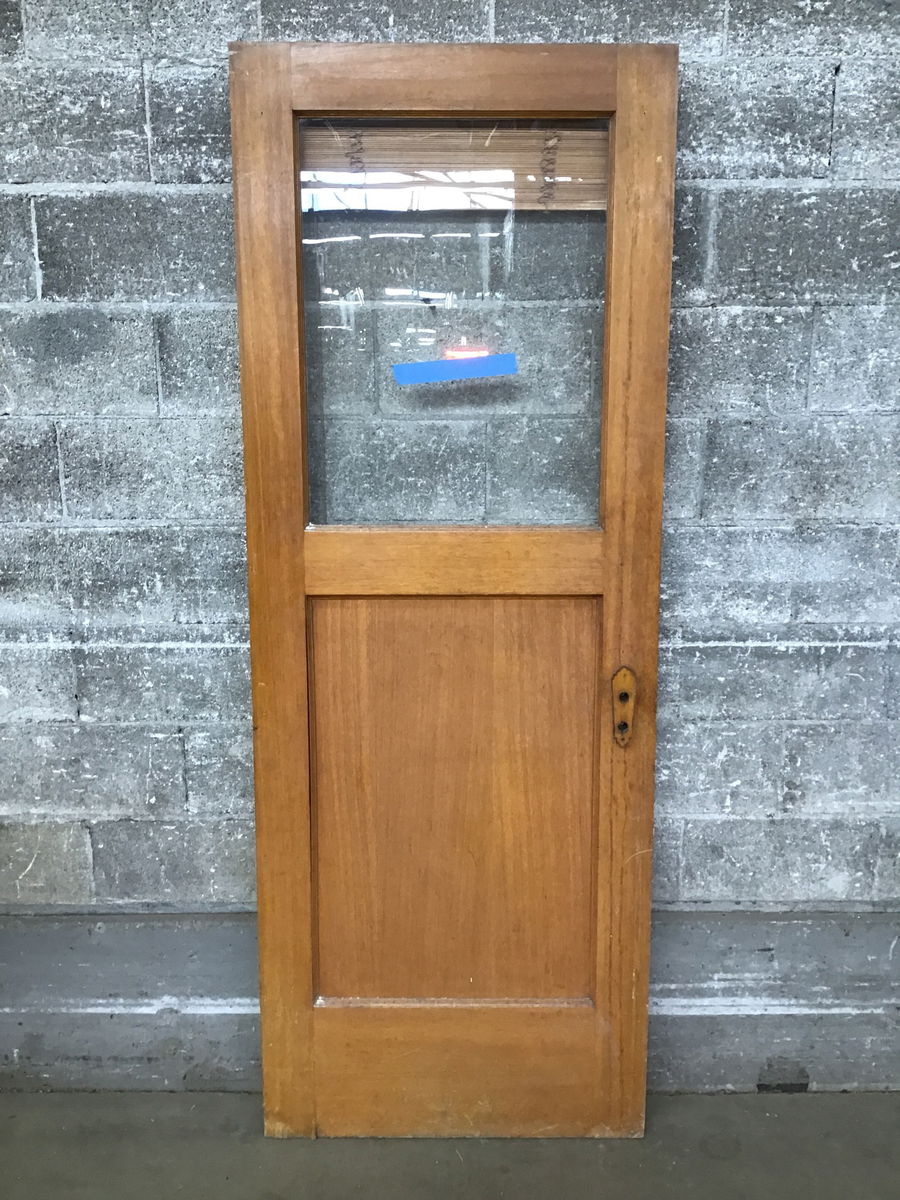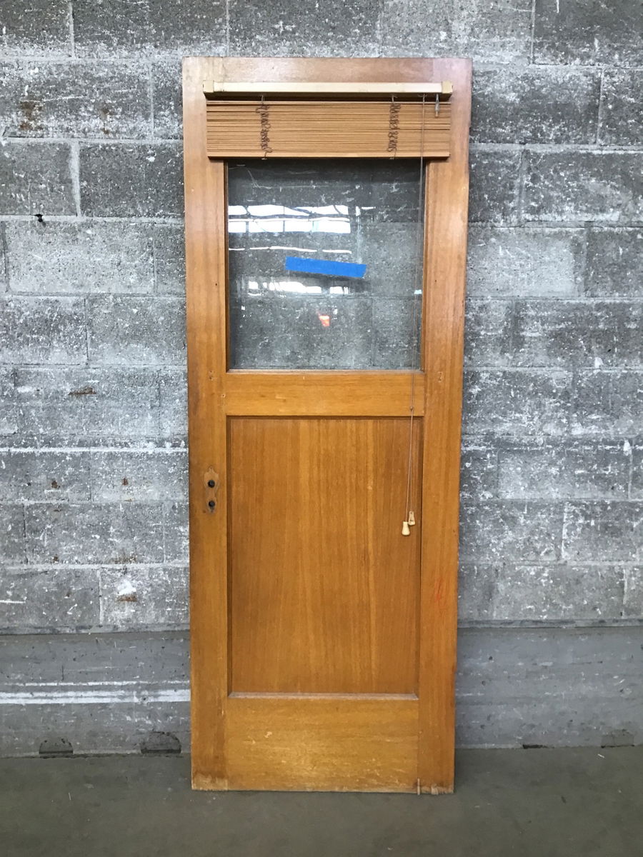 Very handsome half lite interior door featuring a luscious mahogany veneer and wooden blinds. The veneer is peeling a tad along the bottom edge, but it's still a gorgeous door.