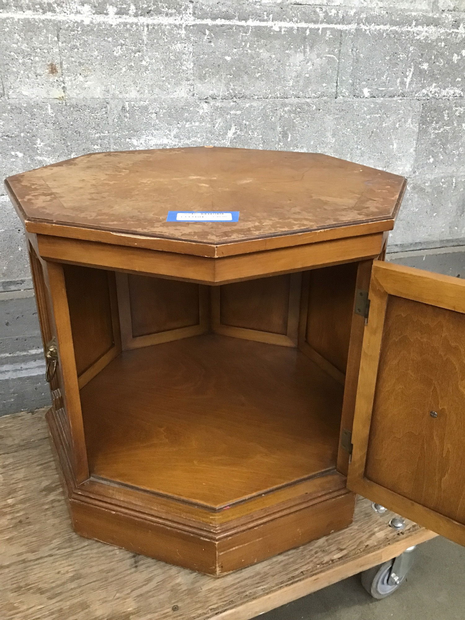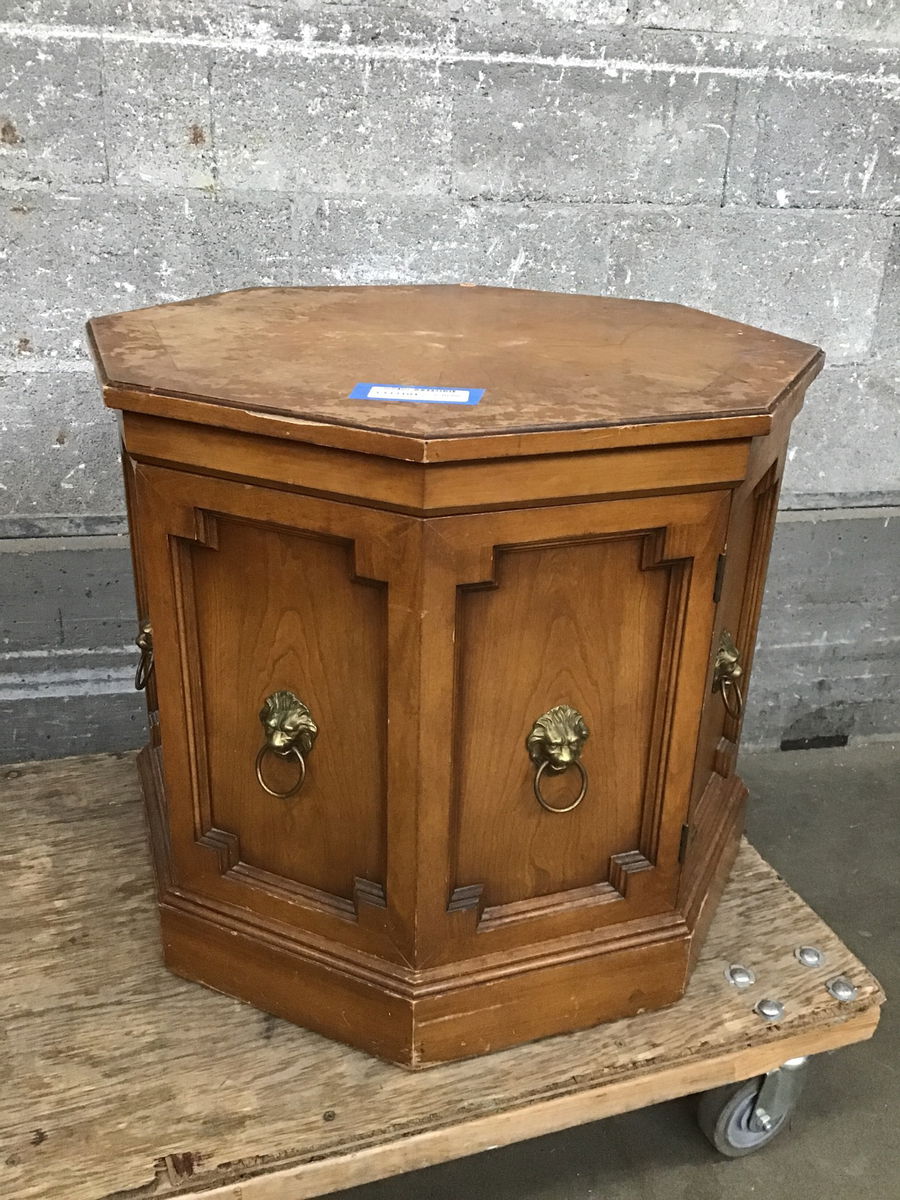 A hexagonal side table that looks to be maple, with one wide door that opens to a little cubby. It's got some brassy hardware in the shape of a lion's head. It could use some TLC with regards to the finish up top.