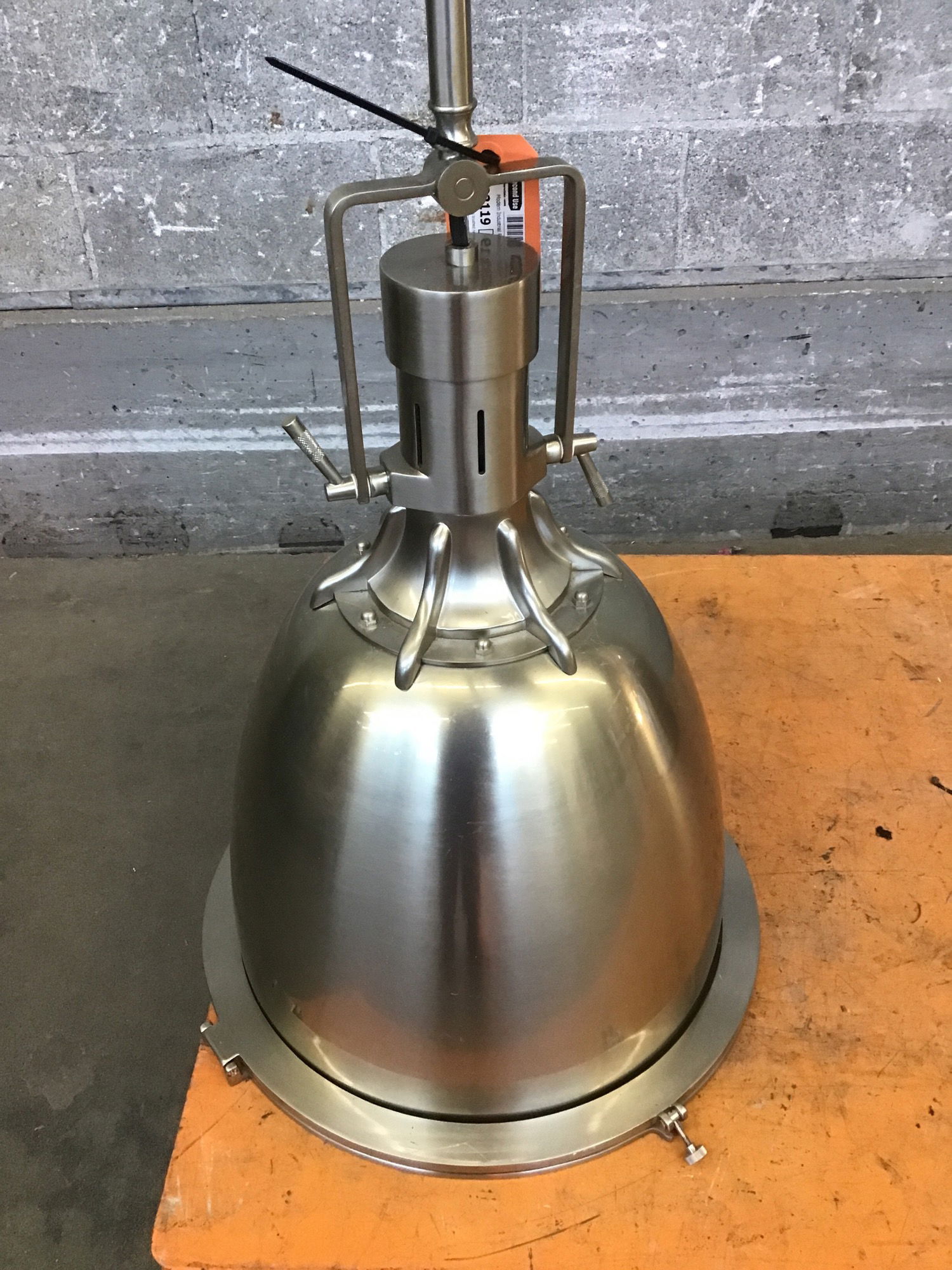 This is an extra long brushed nickel pendant light with a large bulb housing that gives me industrial vibes. The housing has a translucent diffuser and holds two bulbs.
