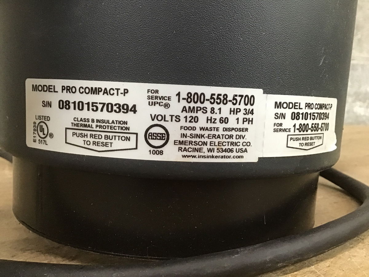 InSinkErator 3/4 HP disposal that seems to work fine. If you need a drain assembly, ask someone at Customer Service to find one for you.