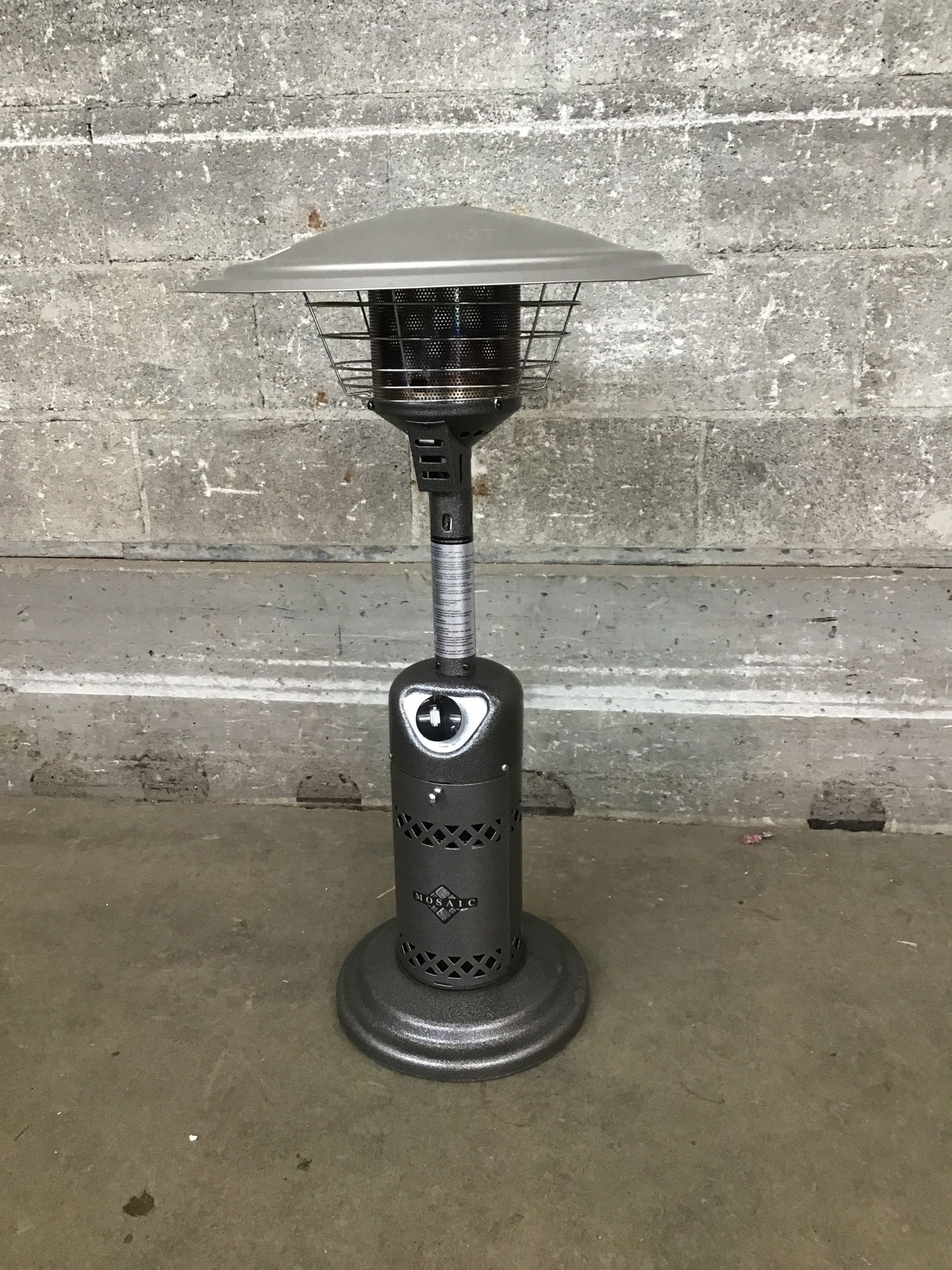 Tabletop Propane Patio Heater by Mosaic. Sold untested. Comes with a convas cover. Spring time is just around the corner!