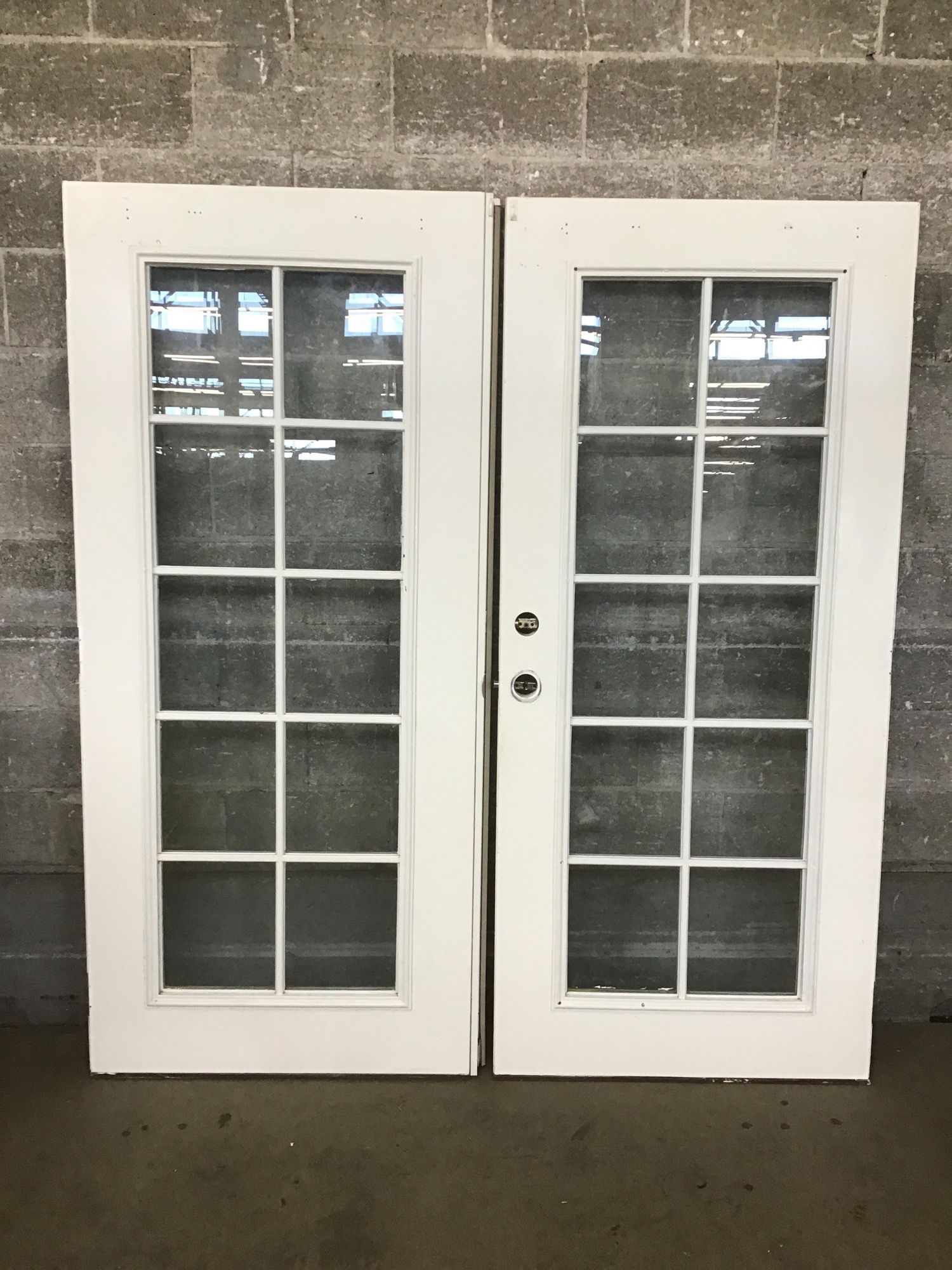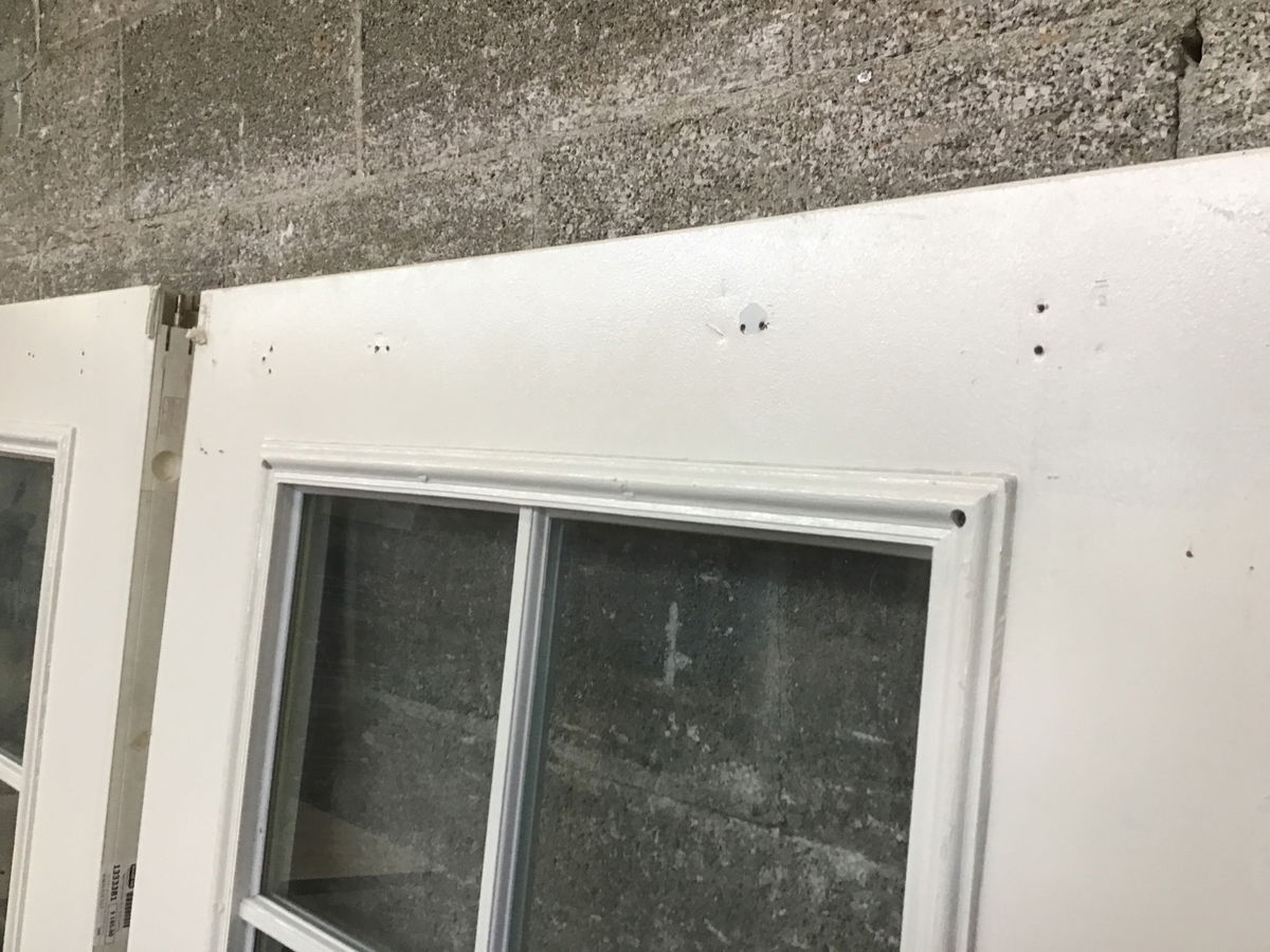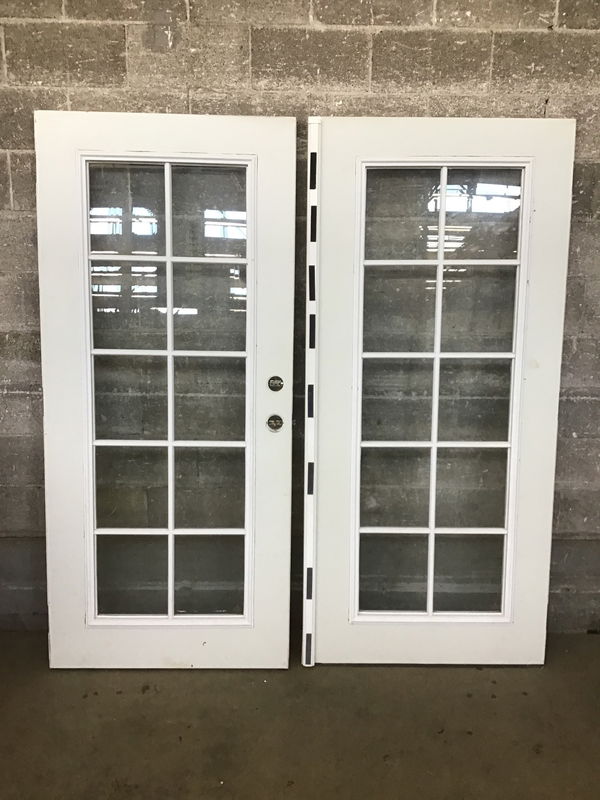 Pair of steel clad full lite doors with insulated glass and faux divided lite grids. The doors show some minor cosmetic wear and screw holes from previous use, which price reflects. This size of door is intended for use in the rough opening that was once occupied by a 6' wide sliding glass door. Once you put a jamb on them, they should approximately fill the same 72' wide gap. Note height.