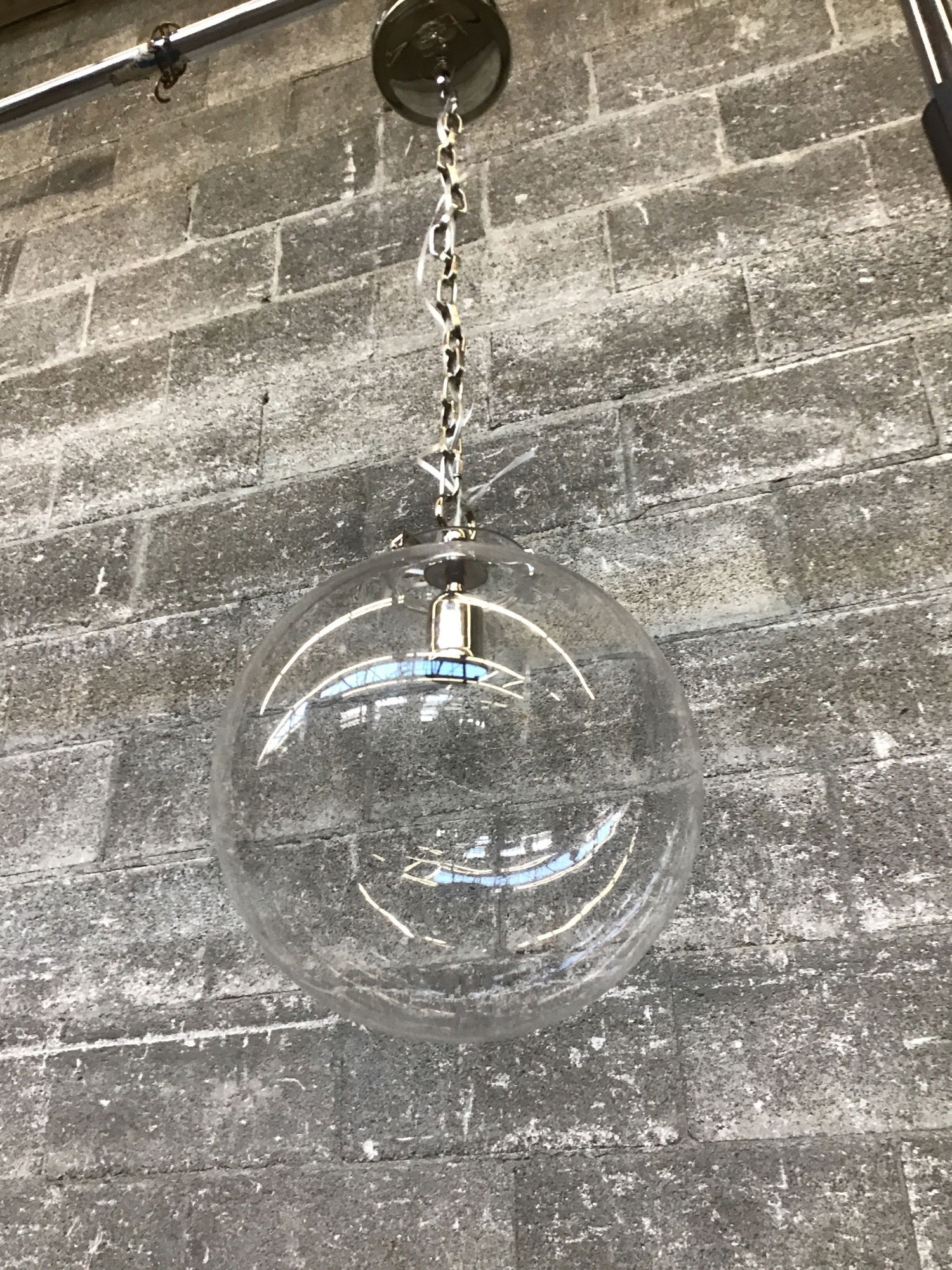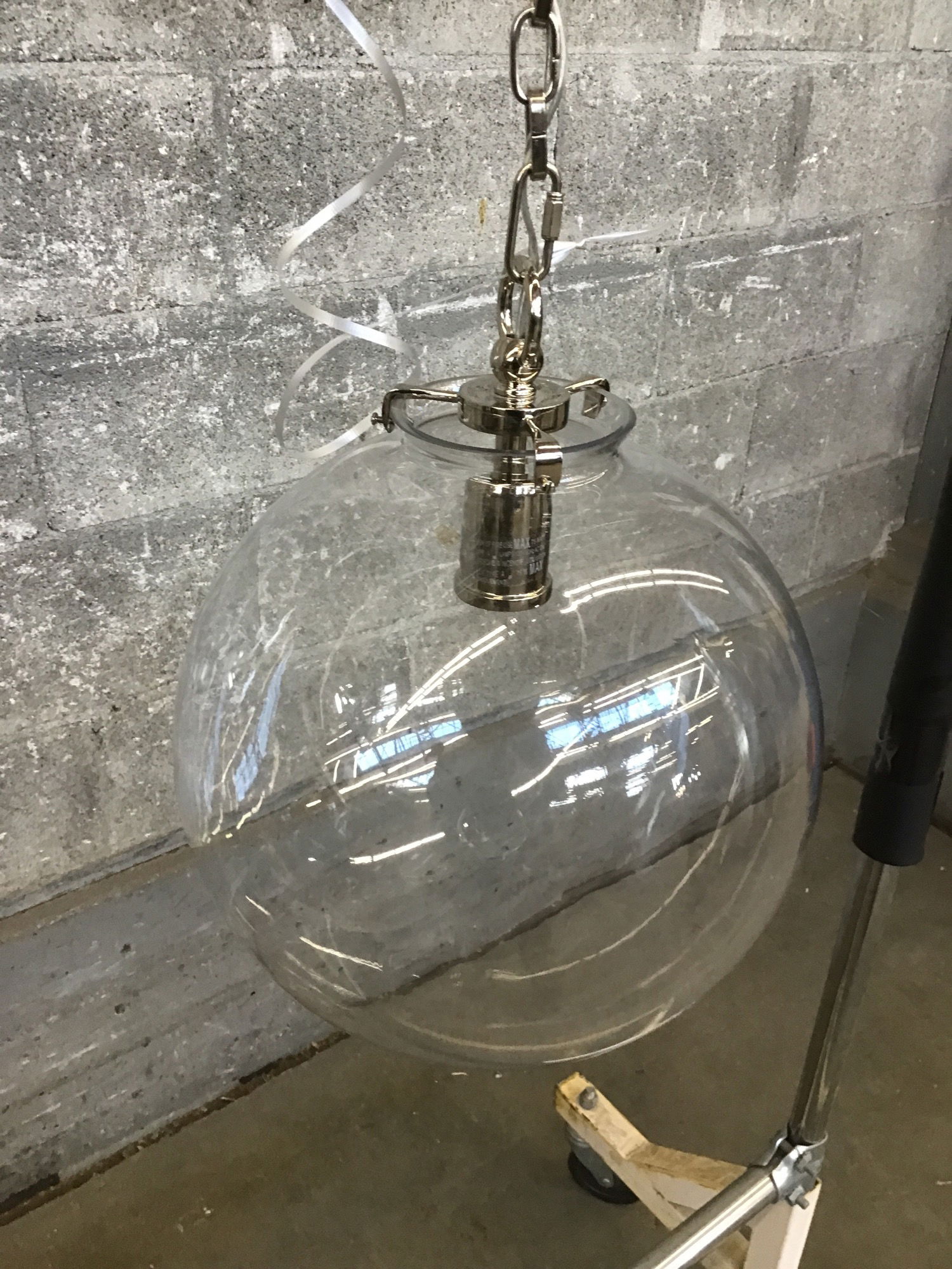 Designed by Thomas O'Brien for his collection with Visual Comfort & Co., this light is part of O'Brien's Katie line, and sports a sleek polished nickel finish to the construction of its canopy and chain, with one 12 inch clear glass globe fitter around the single bulb. Retails new for about $600.