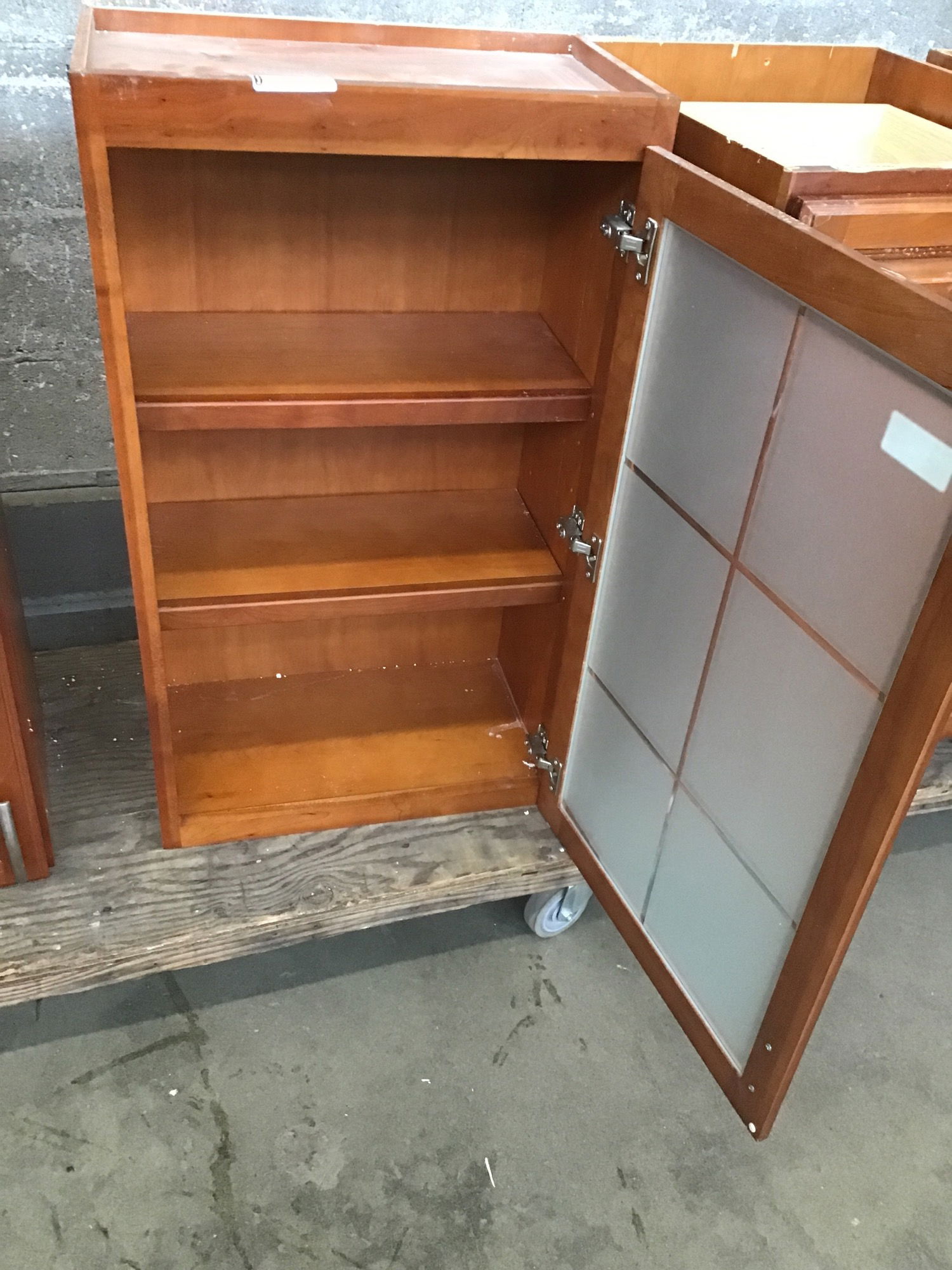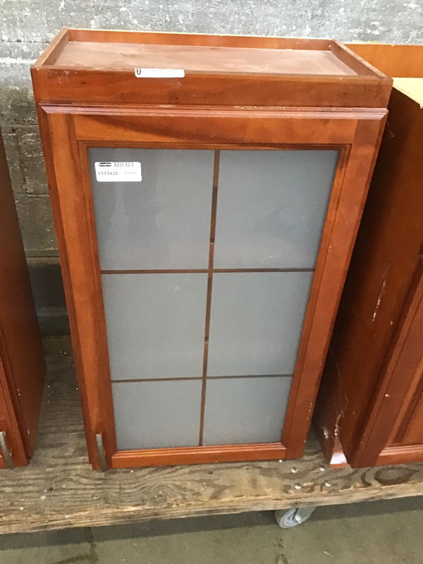 There's faux divided grid frosted glass in the stained cherry door frame. Has two adjustable shelves inside.