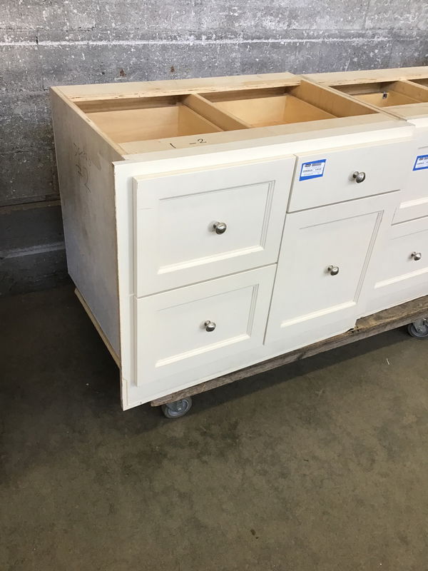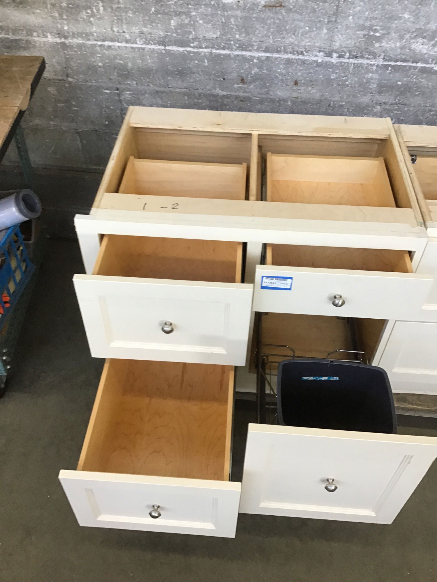 This base cabinet has 4 drawers, the largest of which holds a pull-out trash bin. Has recessed panels and brushed nickel hardware.