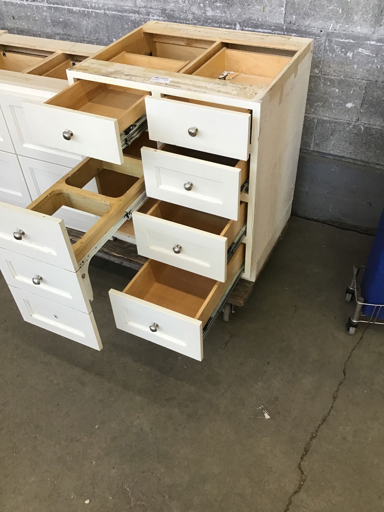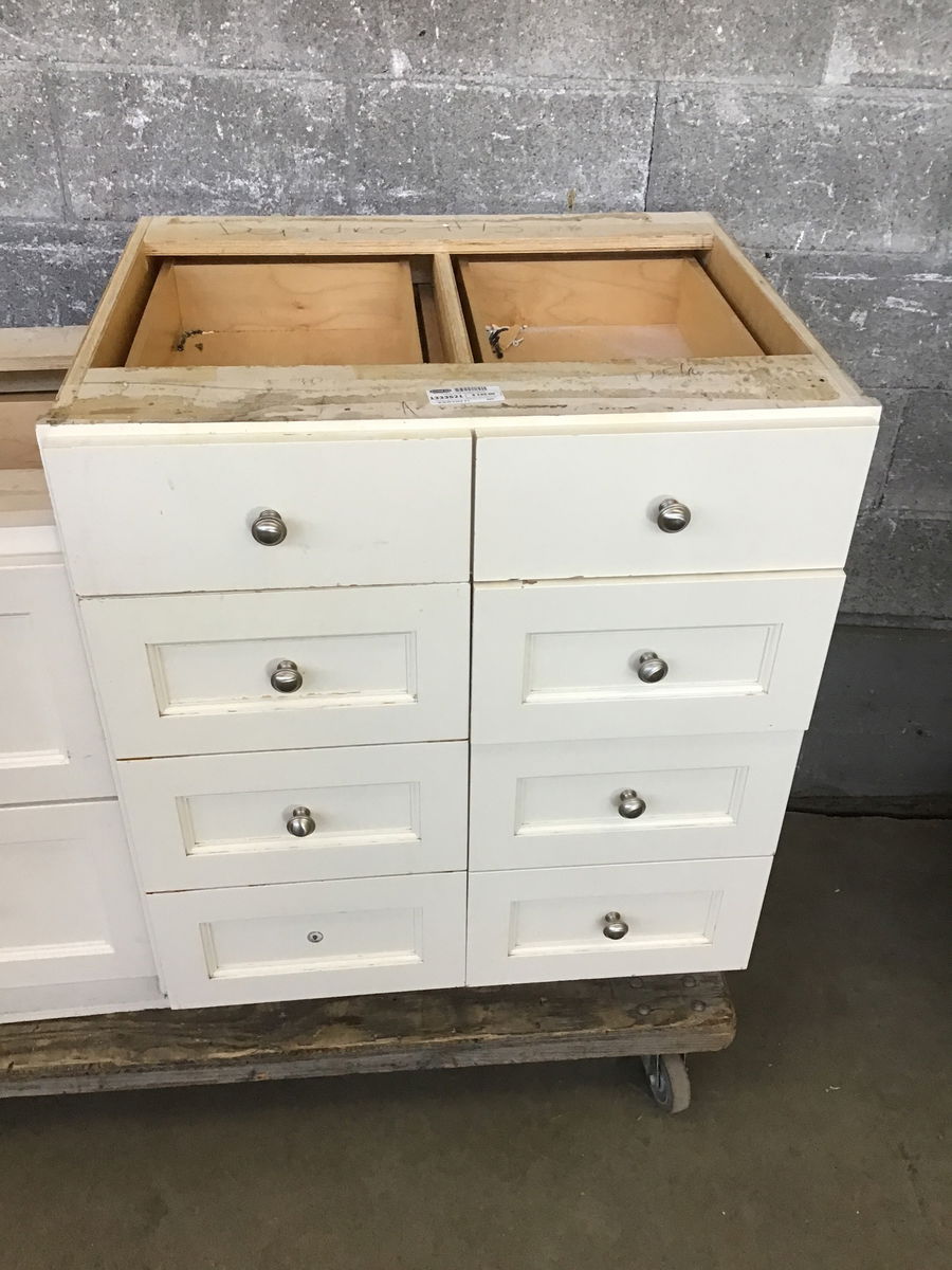 This base cabinet has a 3/4" plywood box and 6 drawers with recessed panels, except the top two. Features a well hidden pull out trash bin holder. Missing one knob.