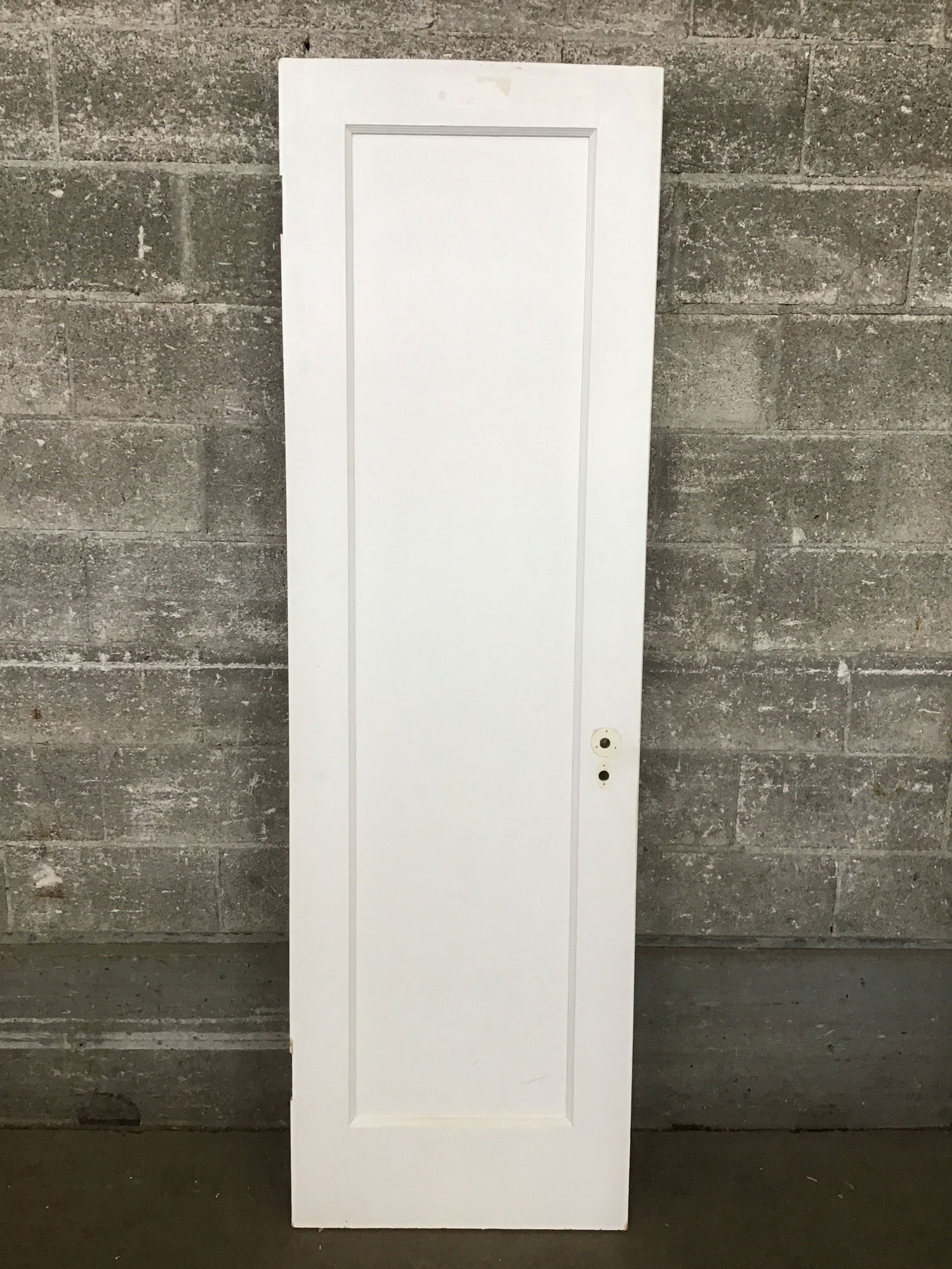 A vintage single panel interior door with a painted white finish. This would make a good door for an older style home or anyone looking to add some vintage charm to your abode.