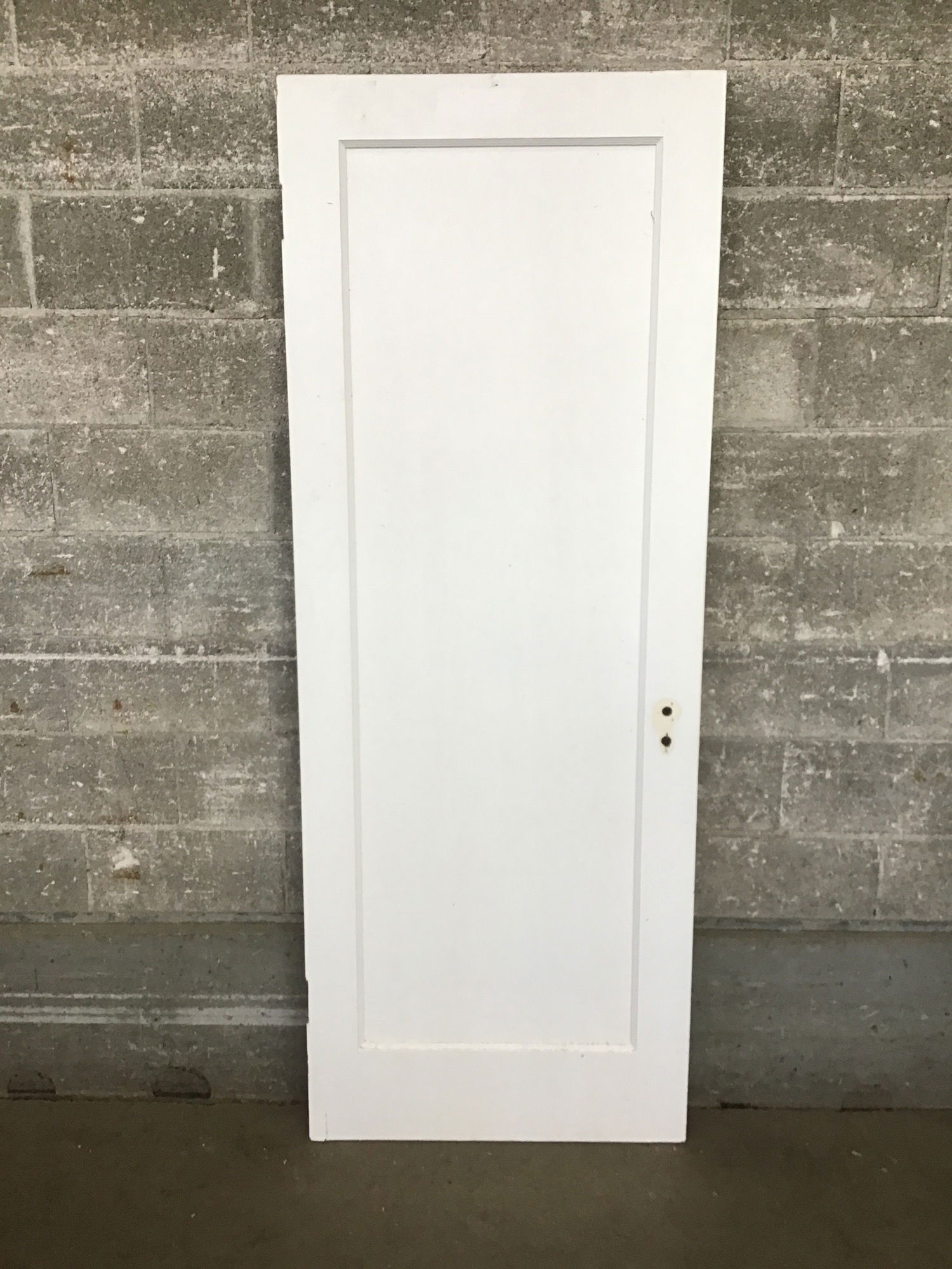 A vintage single panel interior door with a painted white finish. This would make a good door for an older style home or anyone looking to add some vintage charm to your abode.