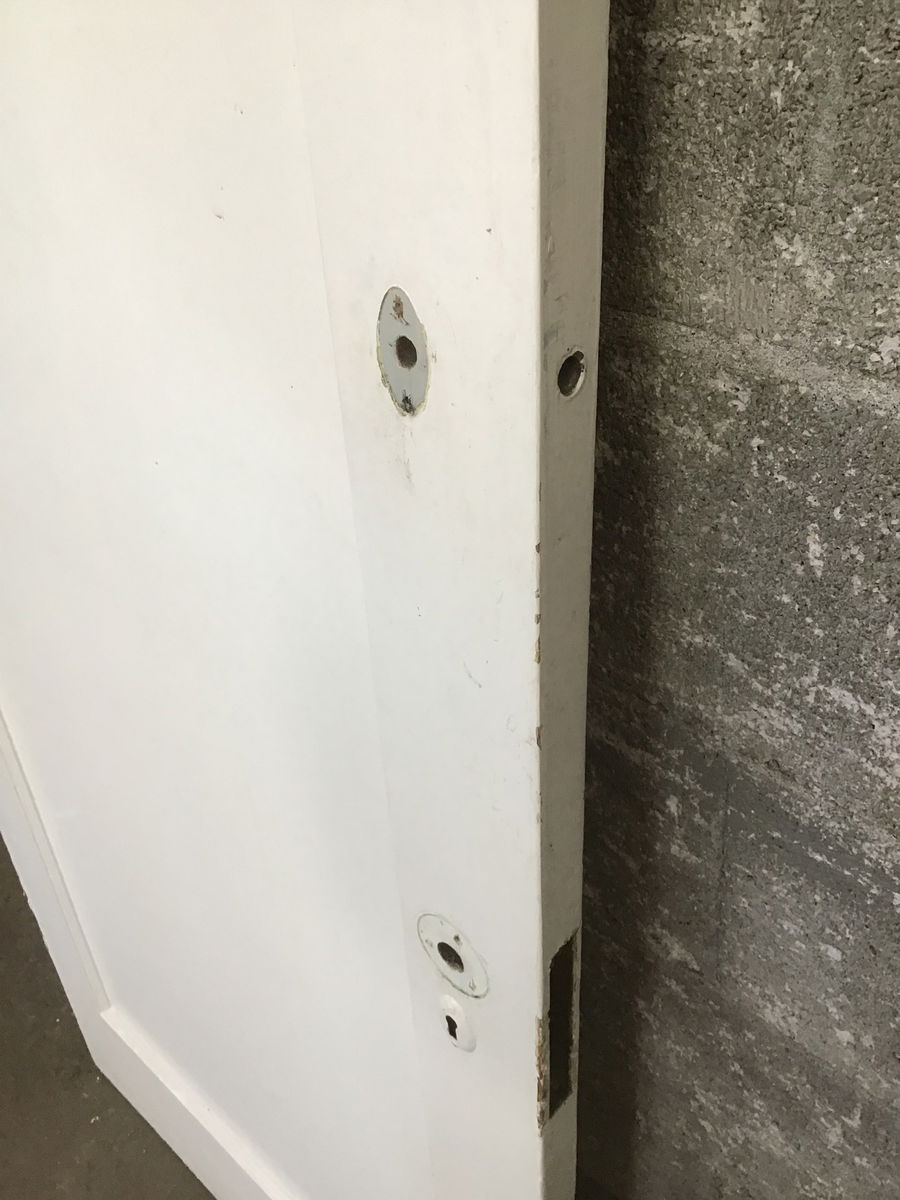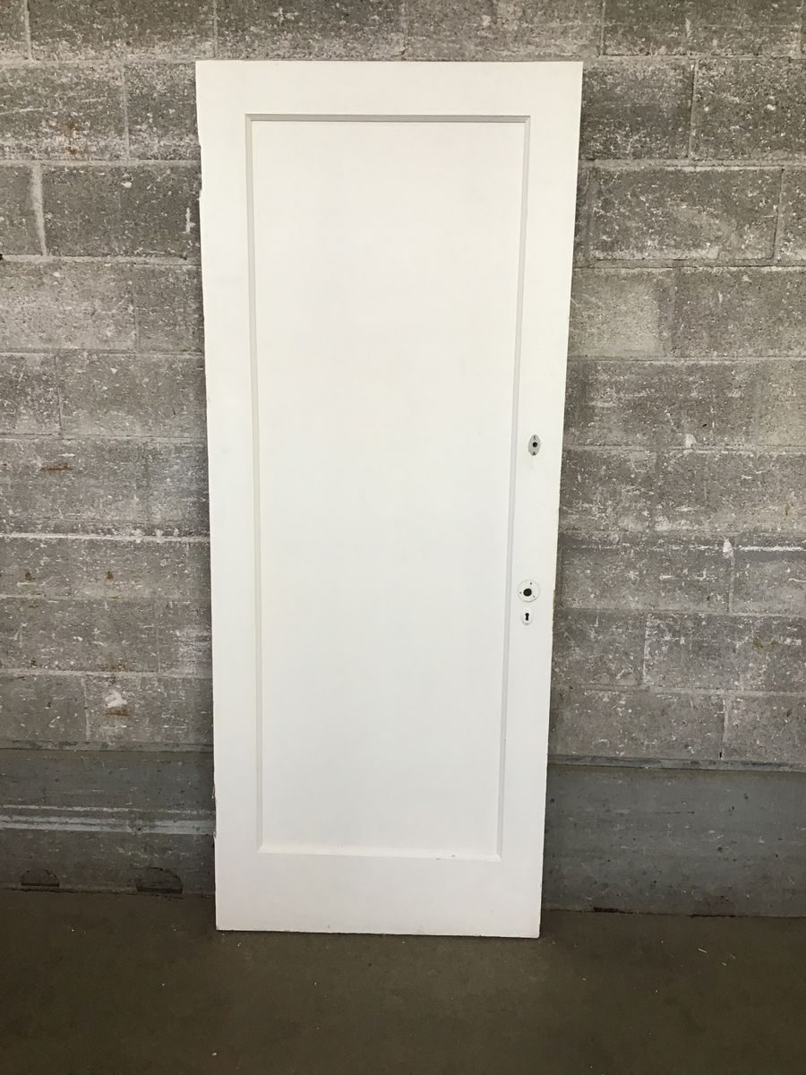 A vintage single panel interior door with a painted white finish. This would make a good door for an older style home or anyone looking to add some vintage charm to your abode.