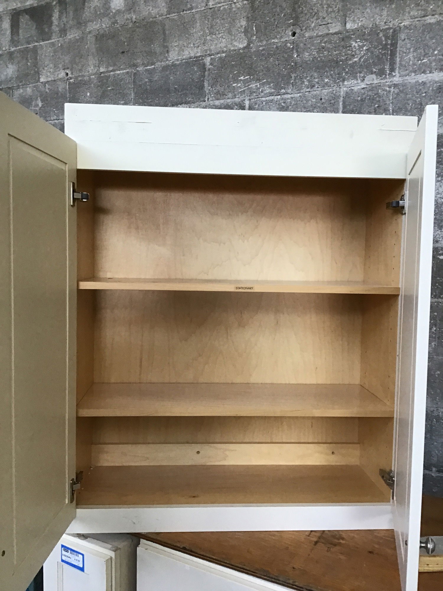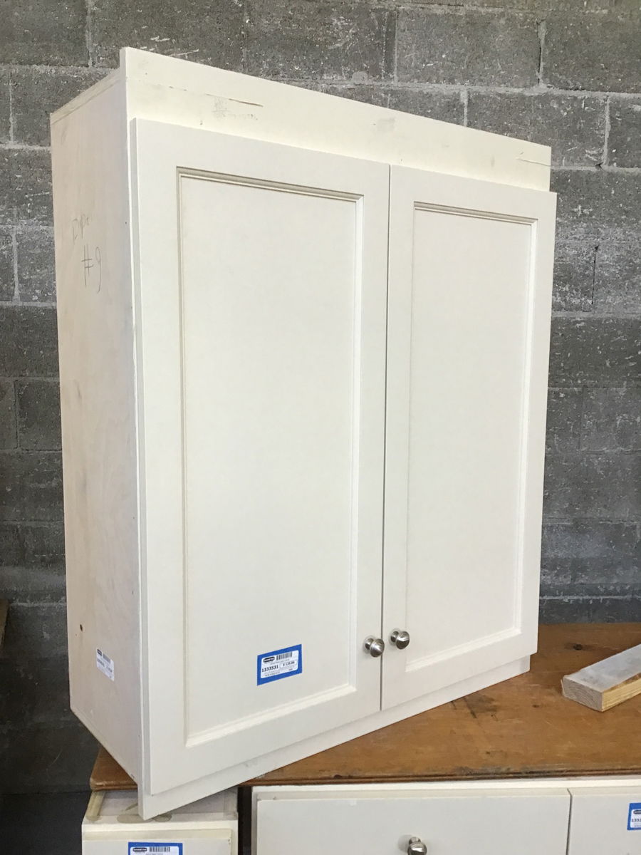 This is a 3/4" plywood box upper cabinet with a painted maple face, recessed panel, brushed nickel knobs, and 3 adjustable shelves.