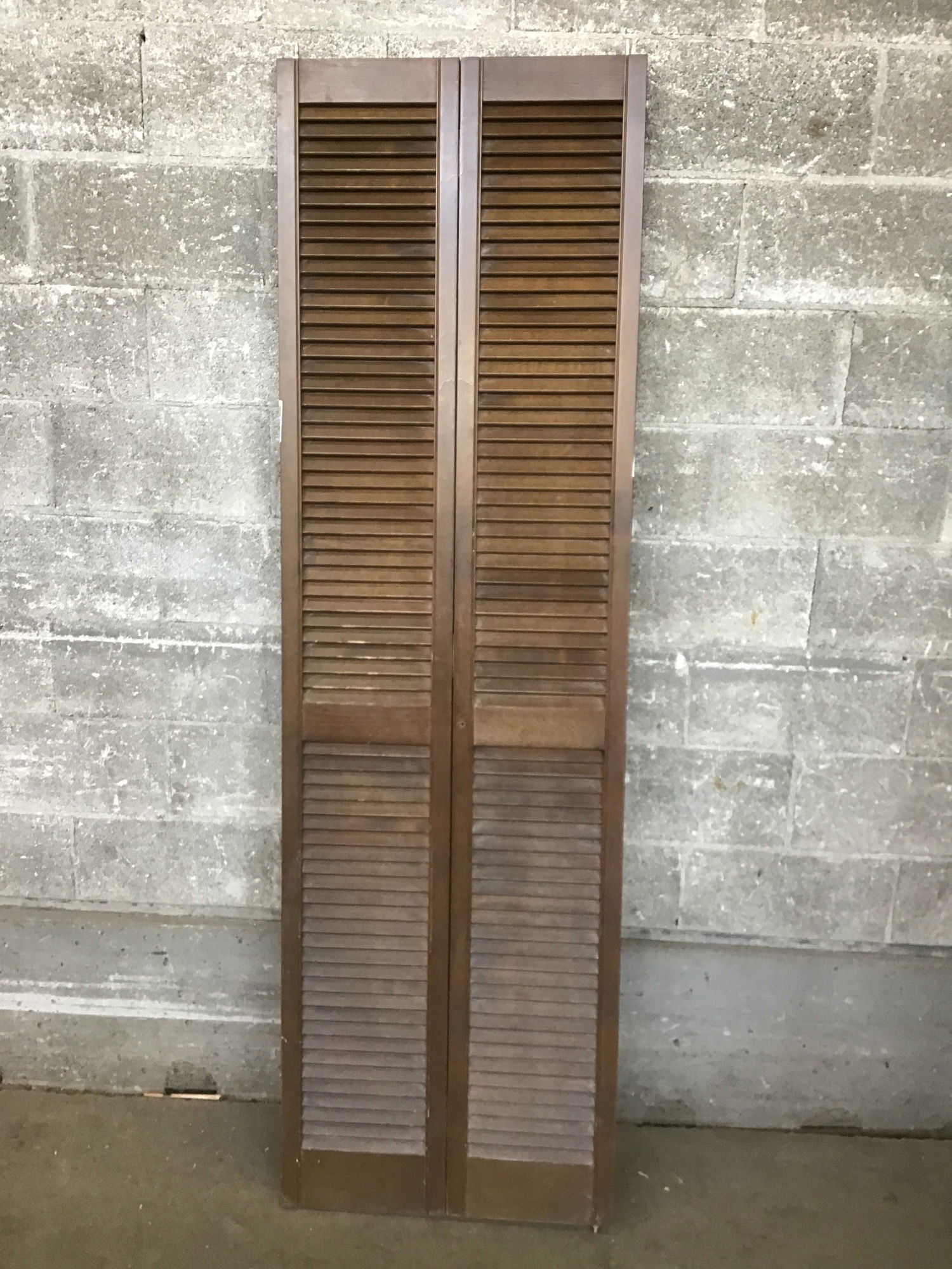 A louvered bi-fold door with a dark brown stain to finish. These would make good pantry or closet doors.