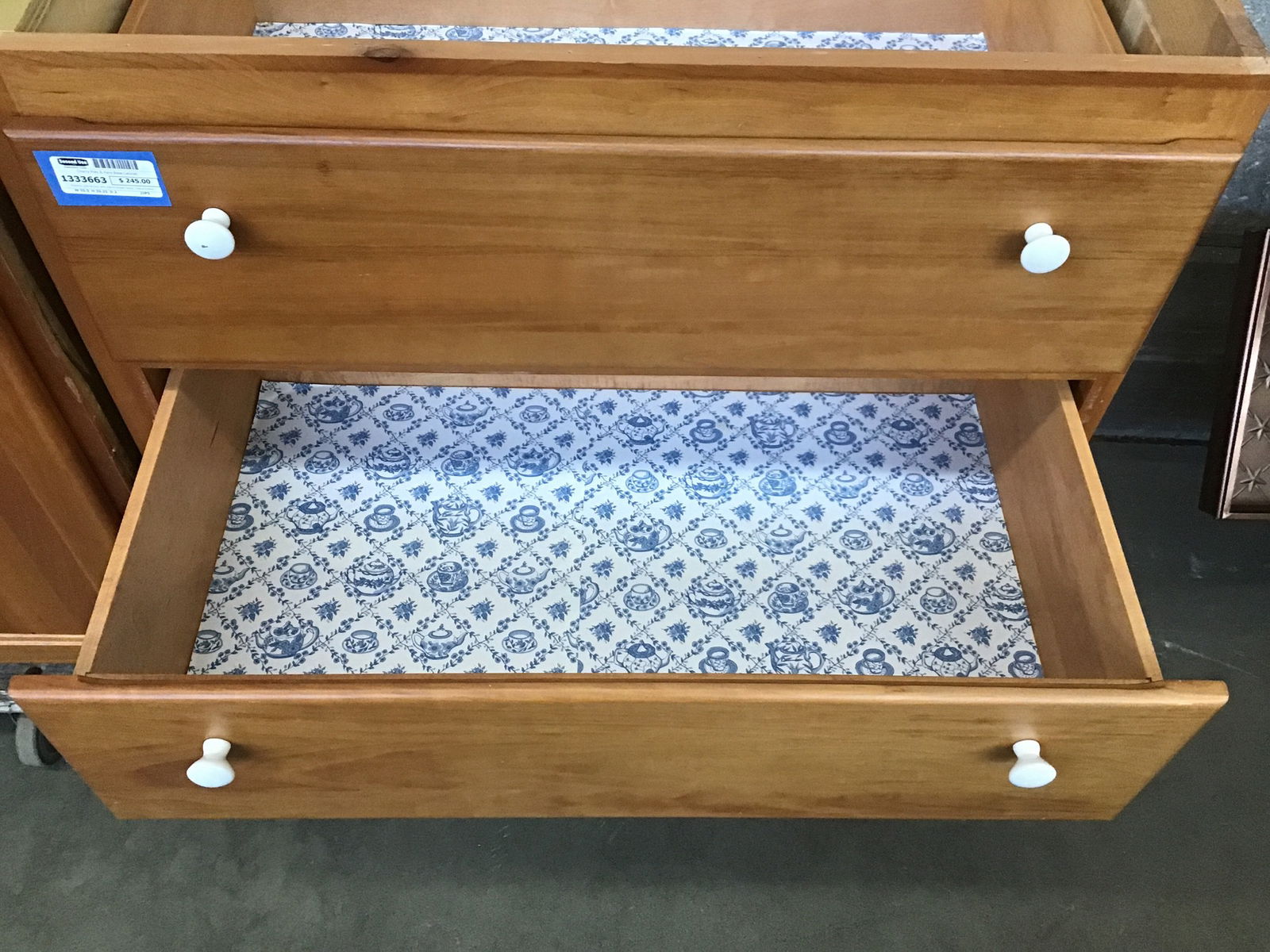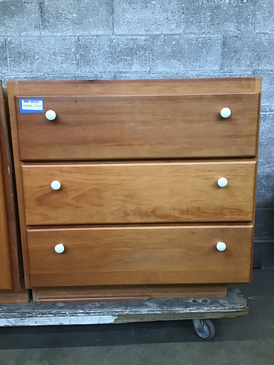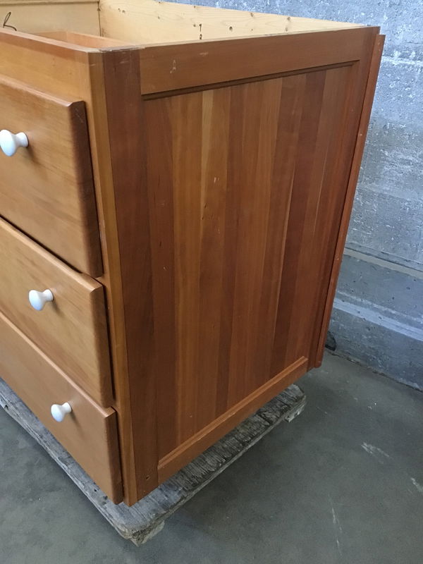 Plywood cabinet box with cherry drawer faces. Has a finished end panel on the right side.
