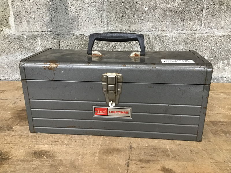 A solid metal Sears Craftsman tool box in a medium grey finish. Includes a removable tool tray and it able to be locked. (lock not included)