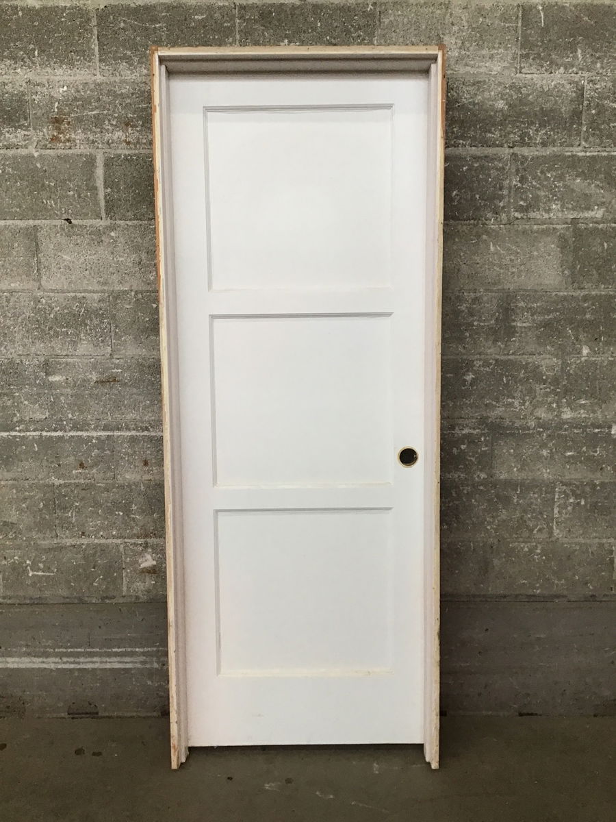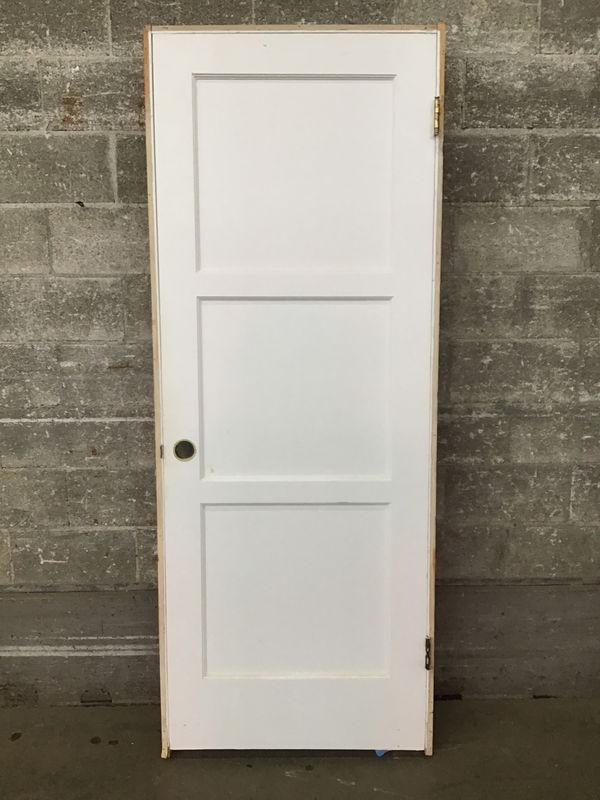 Prehung three-panel door in decent shape, paint is relatively crisp, just need a new knob.