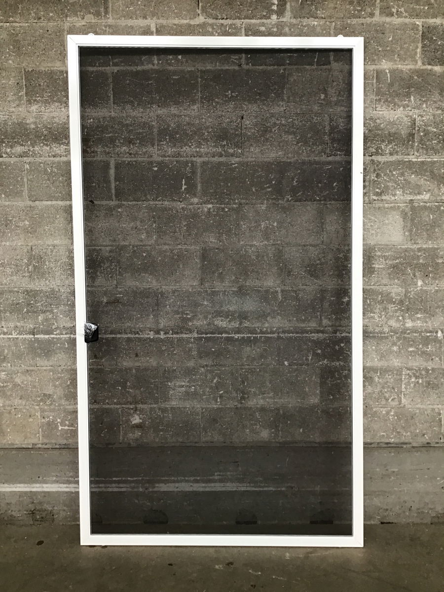 Just out of PlyGem marked cardboard packaging, white aluminum screen door for (I'd guess) an 8' wide x 8' tall sliding patio door.