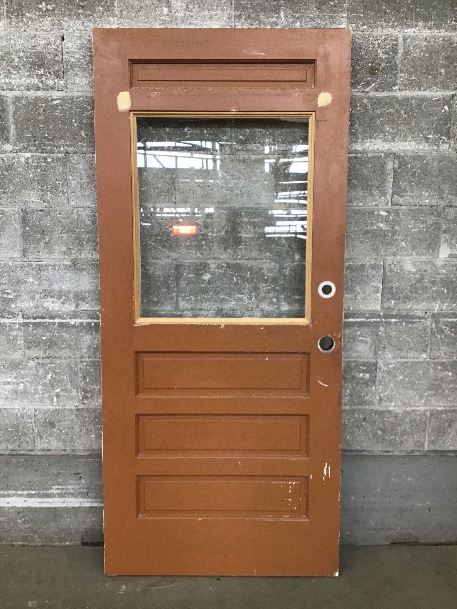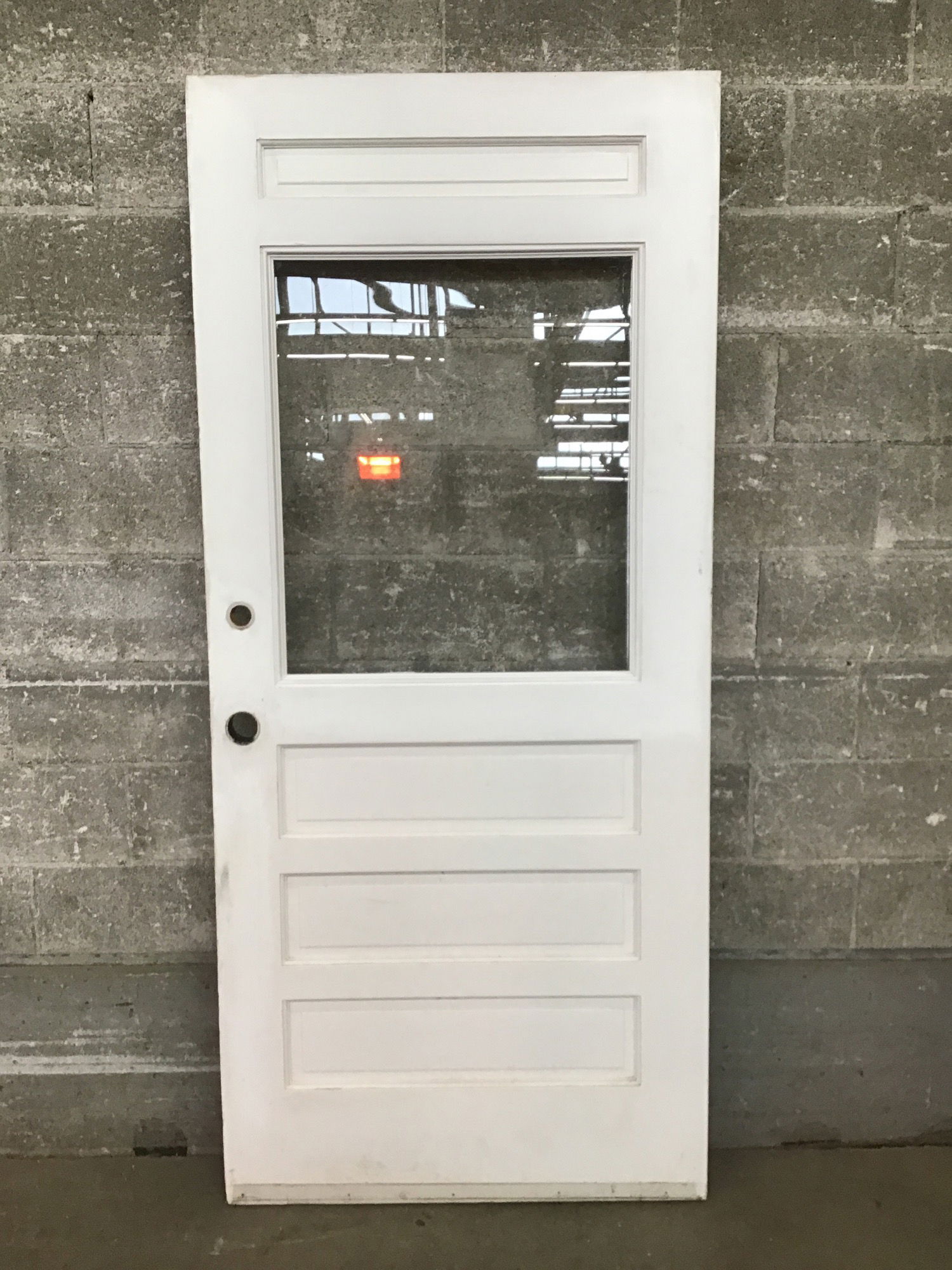 Unique design half lite exterior door with single pane glass. Door looks solid and structurally sound.
