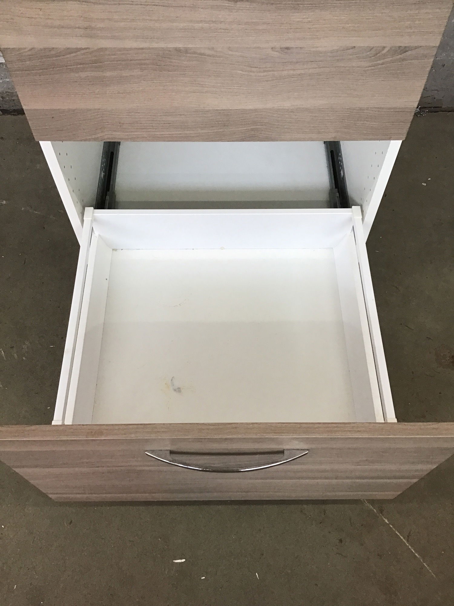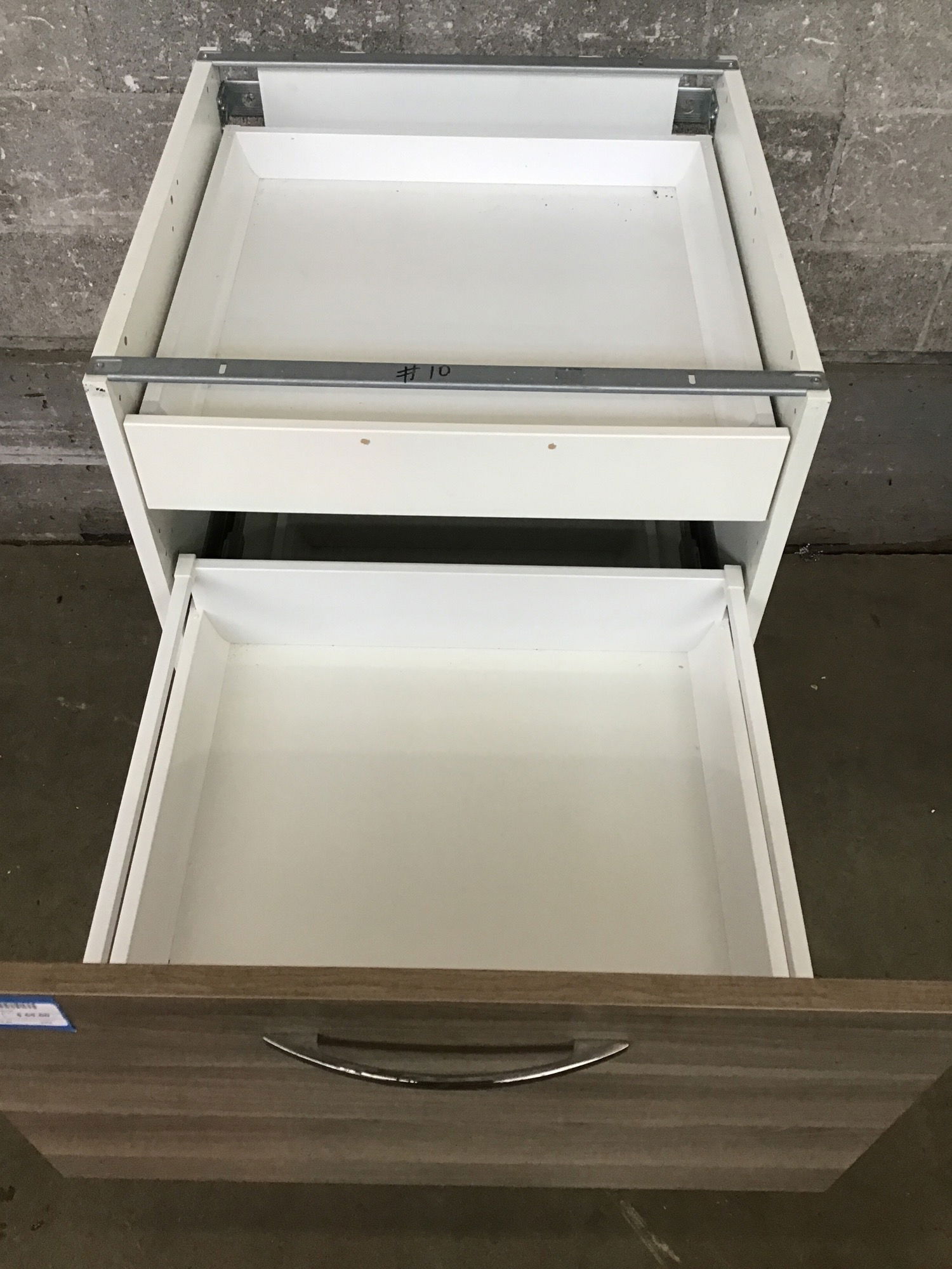 Photo finish face base cabinet with two drawer faces and three drawer boxes (there's a small one above the middle drawer box. Needs a toe kick.