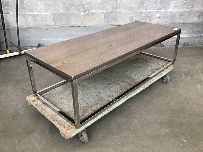 Mitchell Gold brand modern cocktail/coffee table with beach washed Oak veneer and chrome base. Overall in good shape, previously from an office setting-has some mild cosmetic blemishes but ready for more! See it selling new here.
