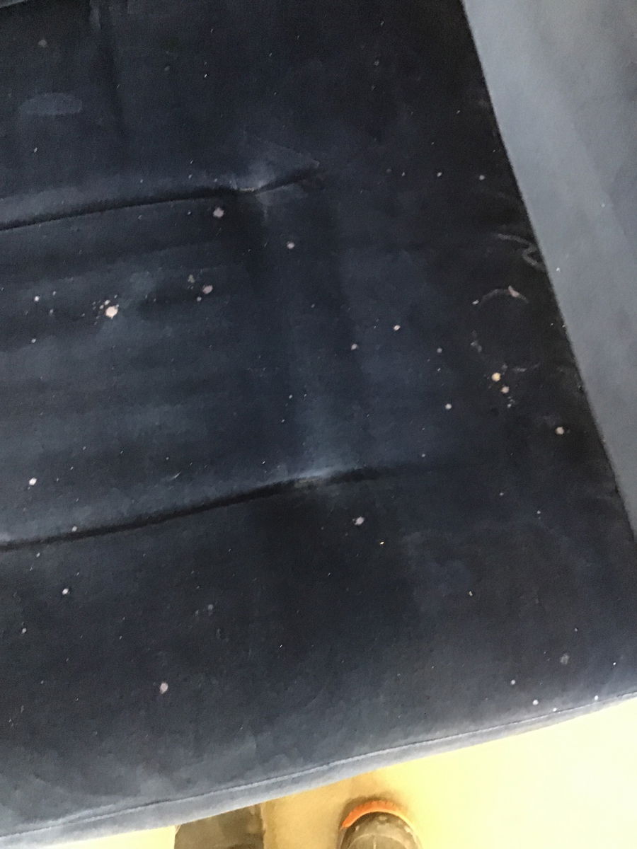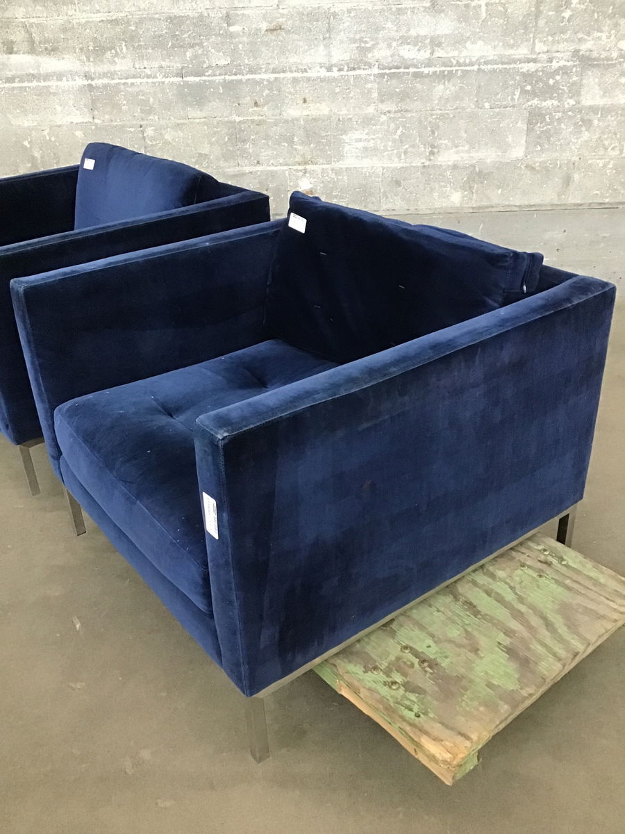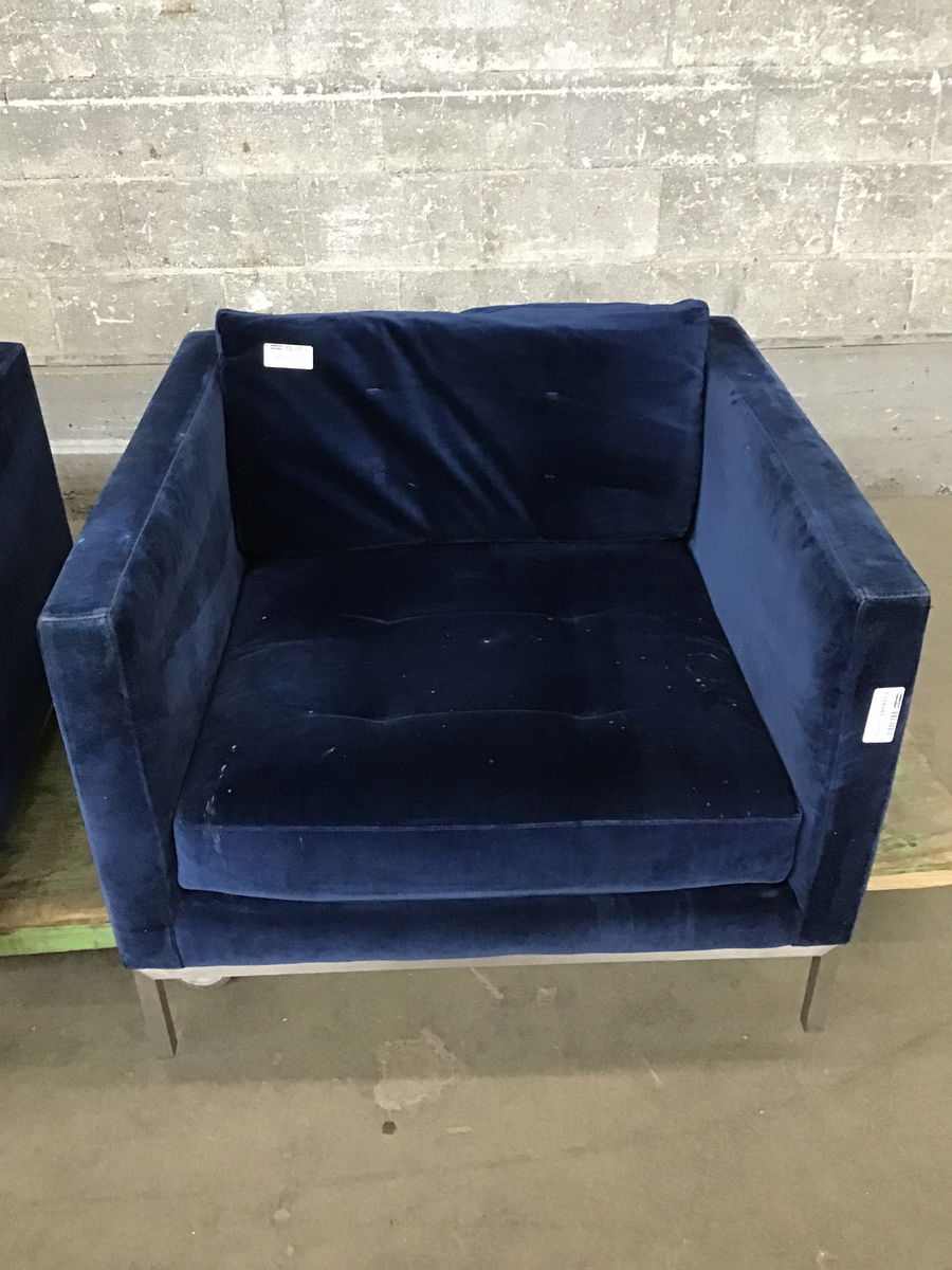 Ca. 2014 blue upholstered chair with stainless steel finish base, made by/for Room & Board, but the fabric is looking a little tired. Price reflects.