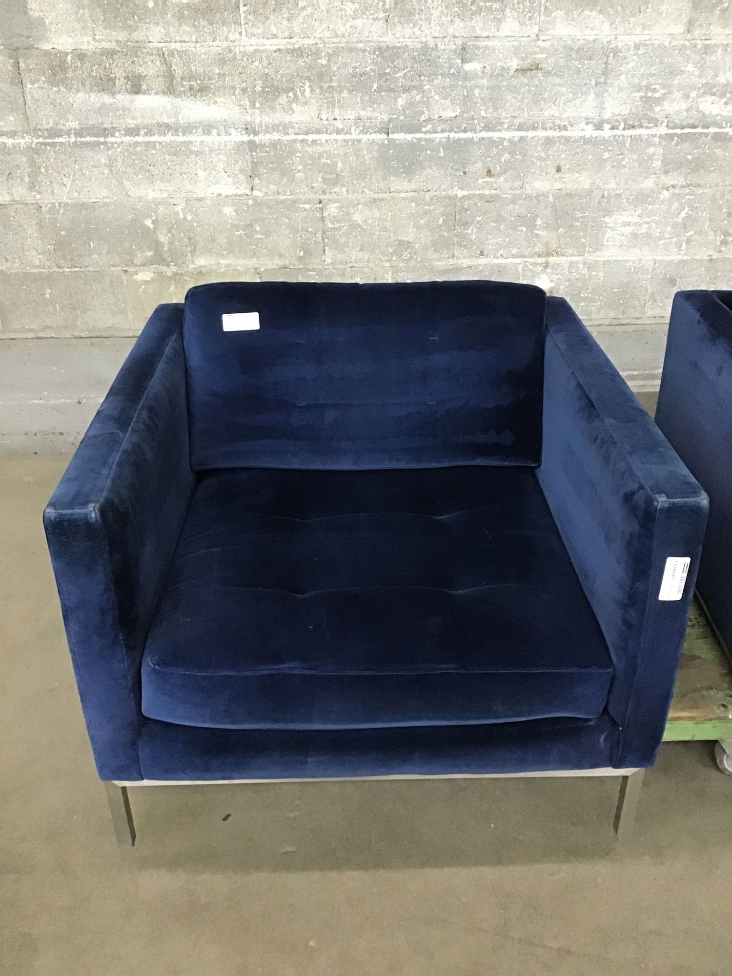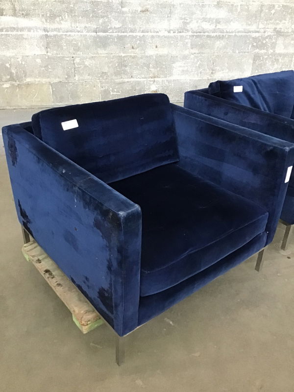 Ca. 2014 blue upholstered chair with stainless steel finish base, made by/for Room & Board, but the fabric is looking a little tired. Price reflects.