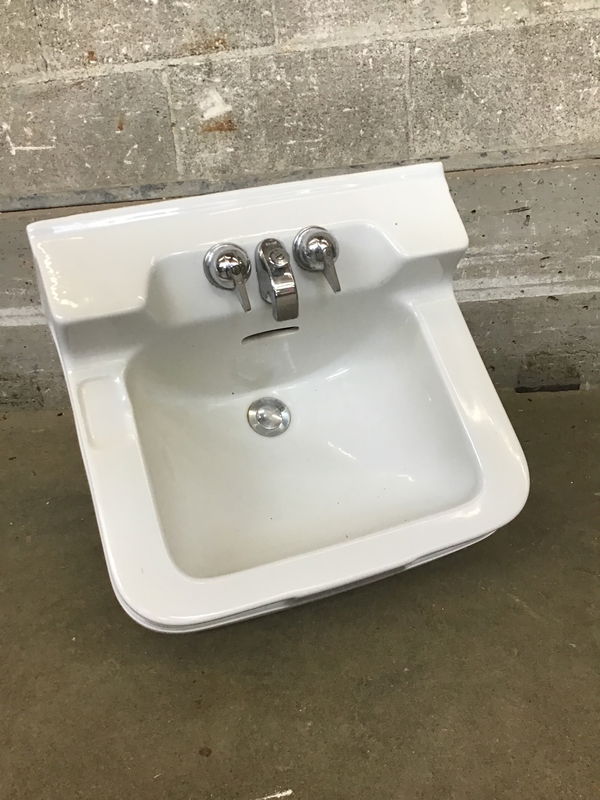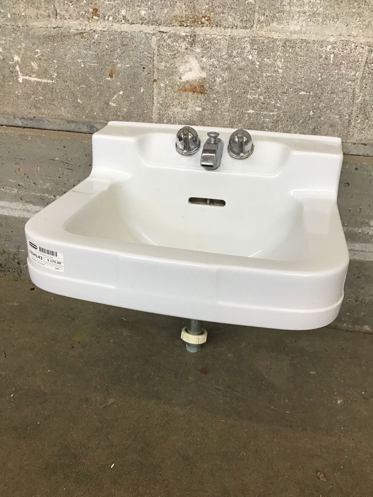 Ca. 1955 Crane "Oxford" wall hung white porcelain bathroom sink with its original neo-angle faucet, which is showing some pitting and wear. It will probably need a rebuild before reinstall. The sink itself looks pretty darn good with no deal breaker cracks or chips. It still has pretty nice luster, as well.