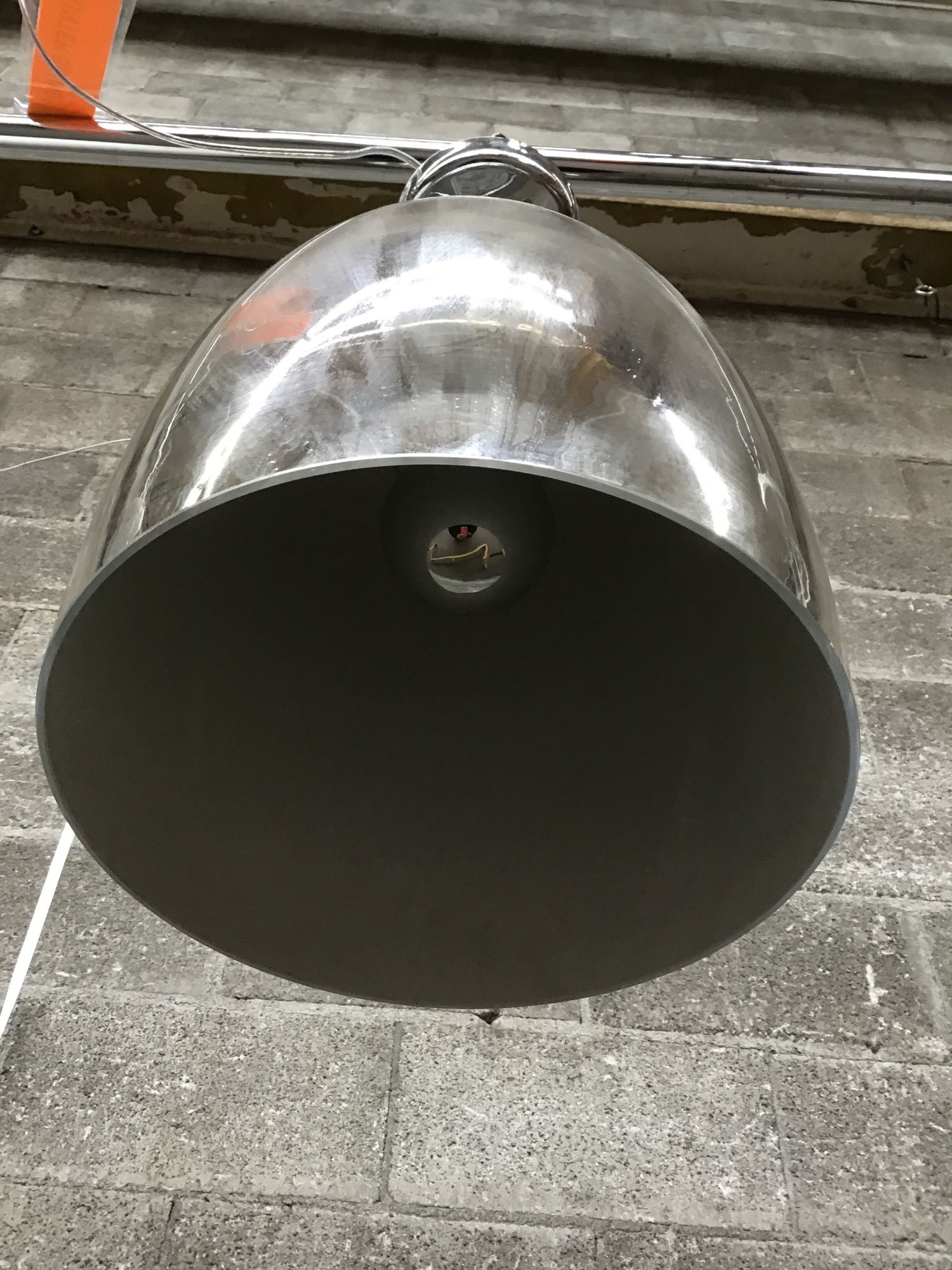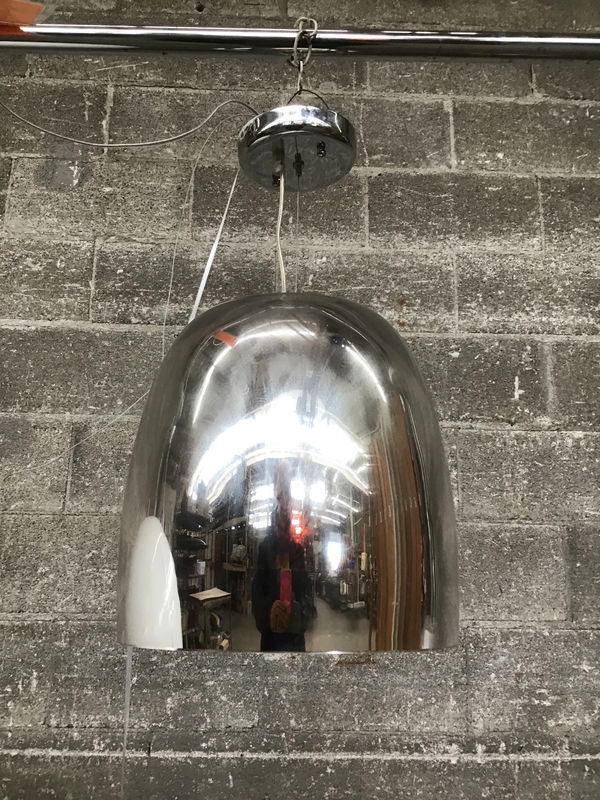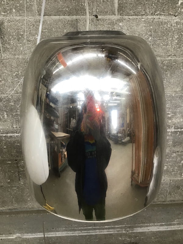 "Notte" mirrored glass pendant light from Prandina. Very sleek curved design, and the height can be adjusted to accommodate taller ceilings.