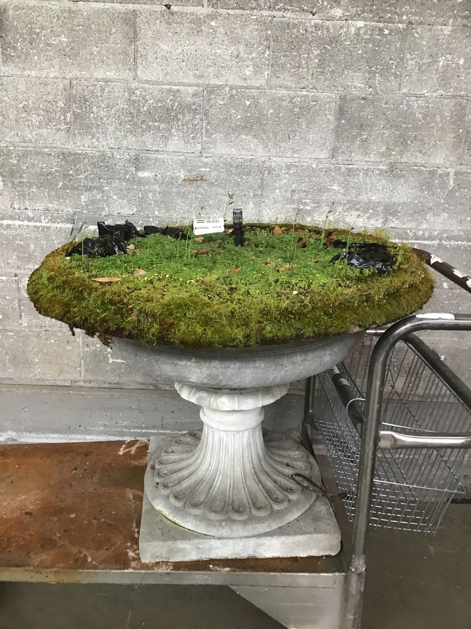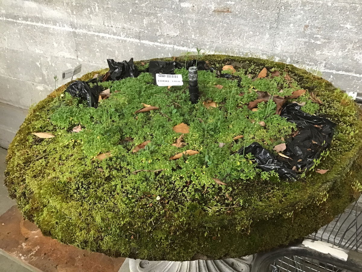 This classical-style concrete fountain really puts the "feature" in water feature! The gem here is the totally darling smorgasbord of moss and tiny greenery blanketing the bowl. It could use a little manicuring, or you could empty out the bowl if you prefer the gentle puddly sound of water splashing in your fountain. There seems to be a pump and spout already installed, though we're selling untested.