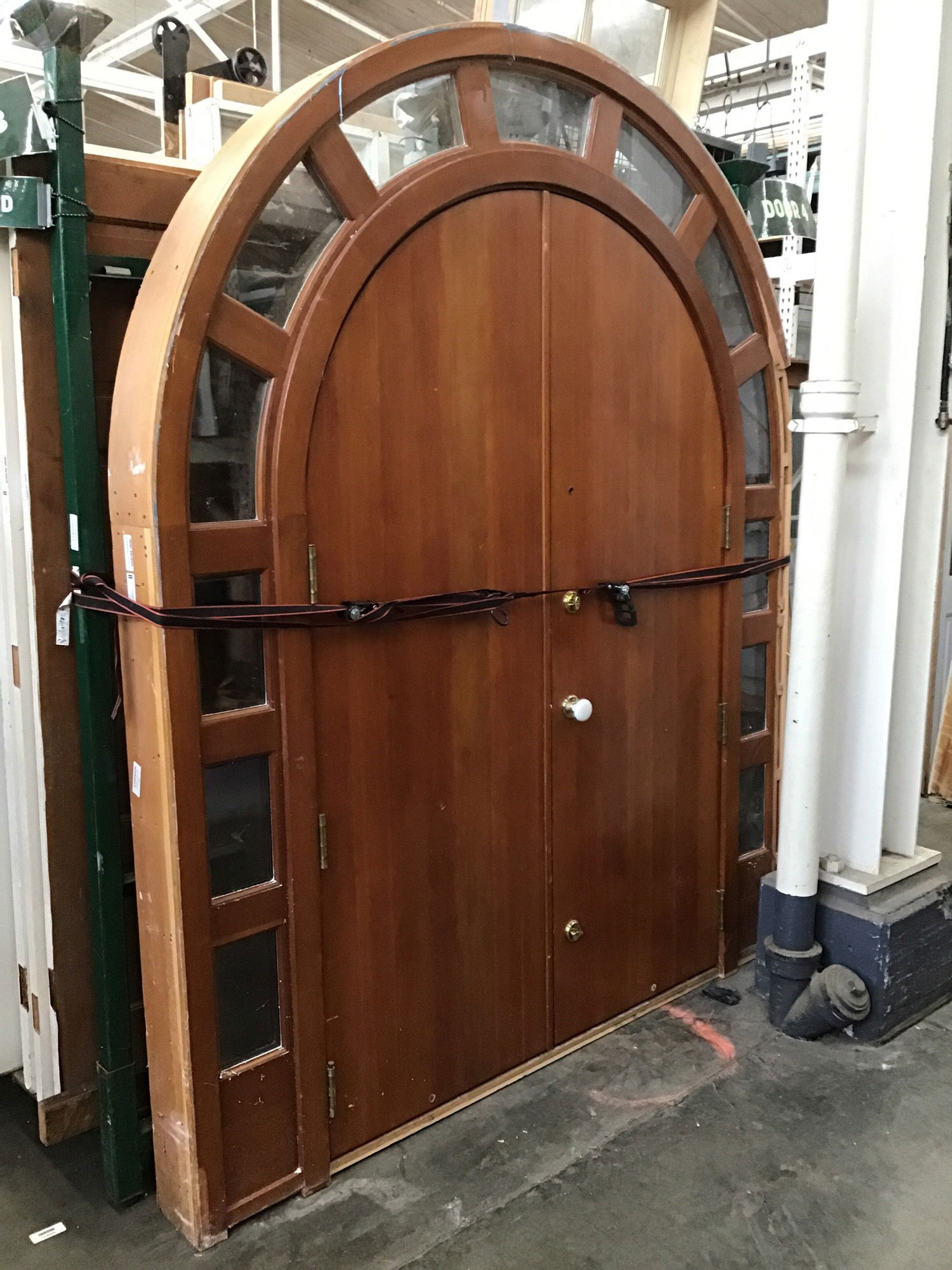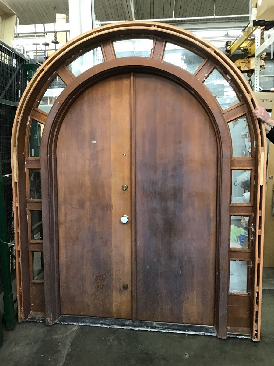 A sweet mama of a double door entry in clear vertical grain fir, with a rounded arch shape and full transom/sidelite arch to boot! The wood is in great shape overall, with a cherry-ish stain that looks a little thirsty on the exterior side. Has two deadbolts installed, along with a porcelain knob and a peephole. Some trim was removed during demo, but we're keeping it safe in our customer service area for ya!