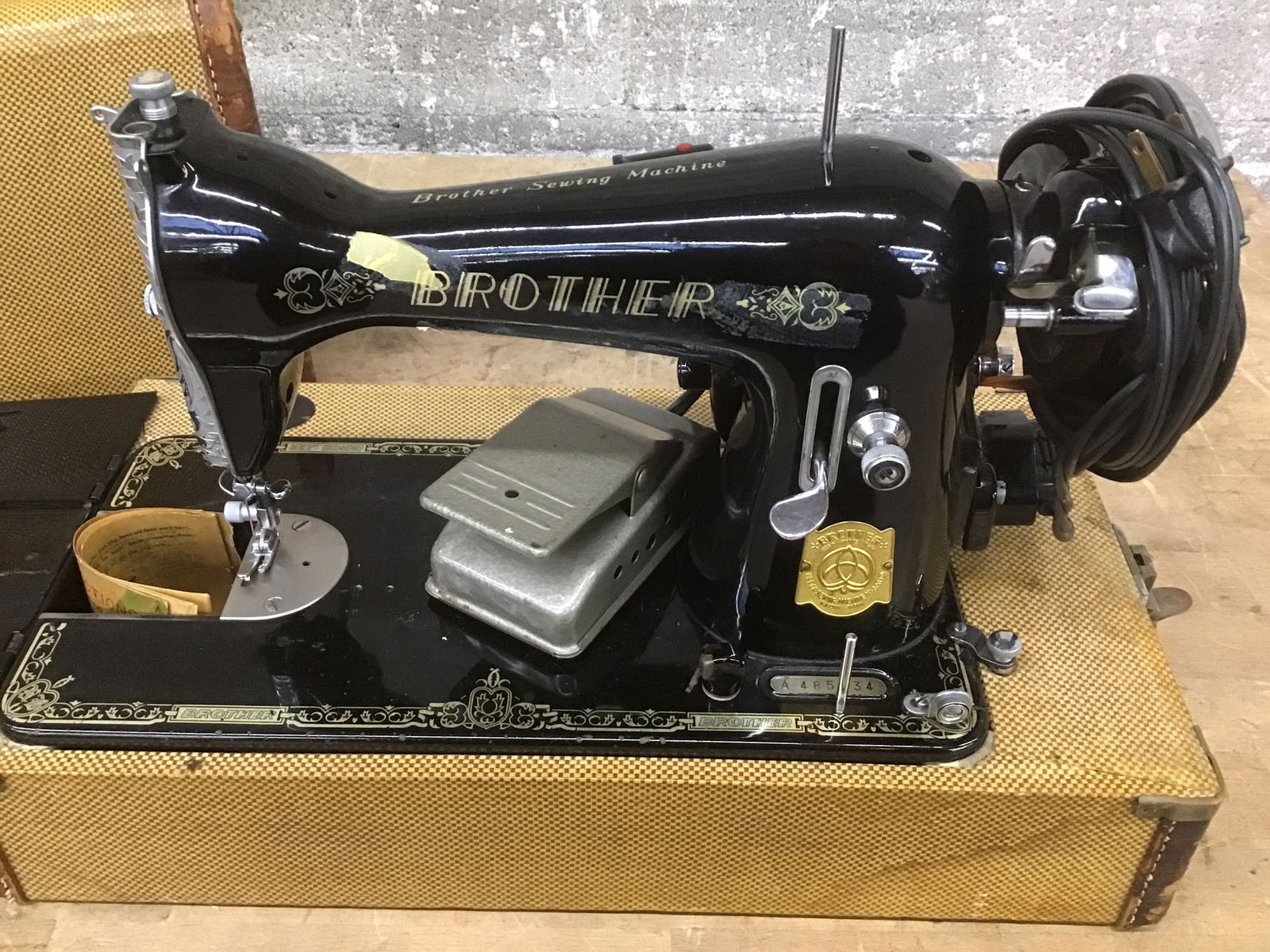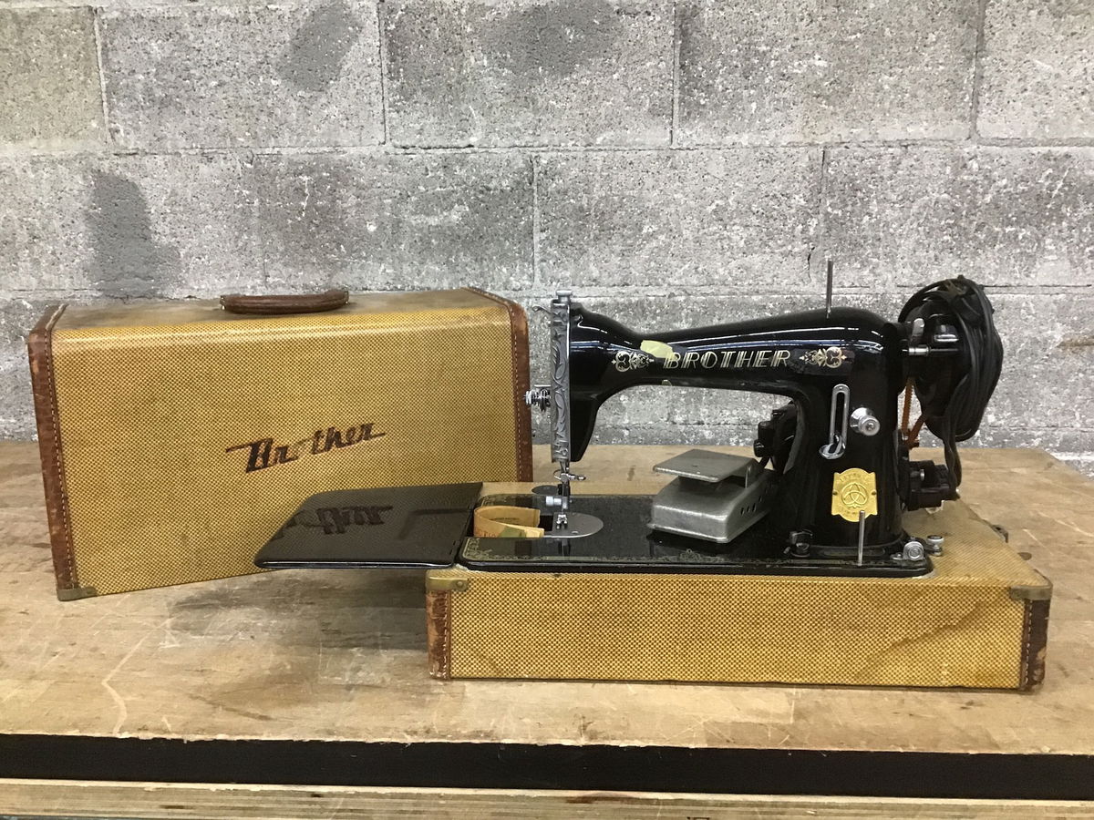 Vintage electric sewing machine by Brother. Has a portable carrying case and a sleek black finish. Motor operates smoothly. Has a few imperfections -- missing cover plate, broken light. But overall a nice, usable unit.