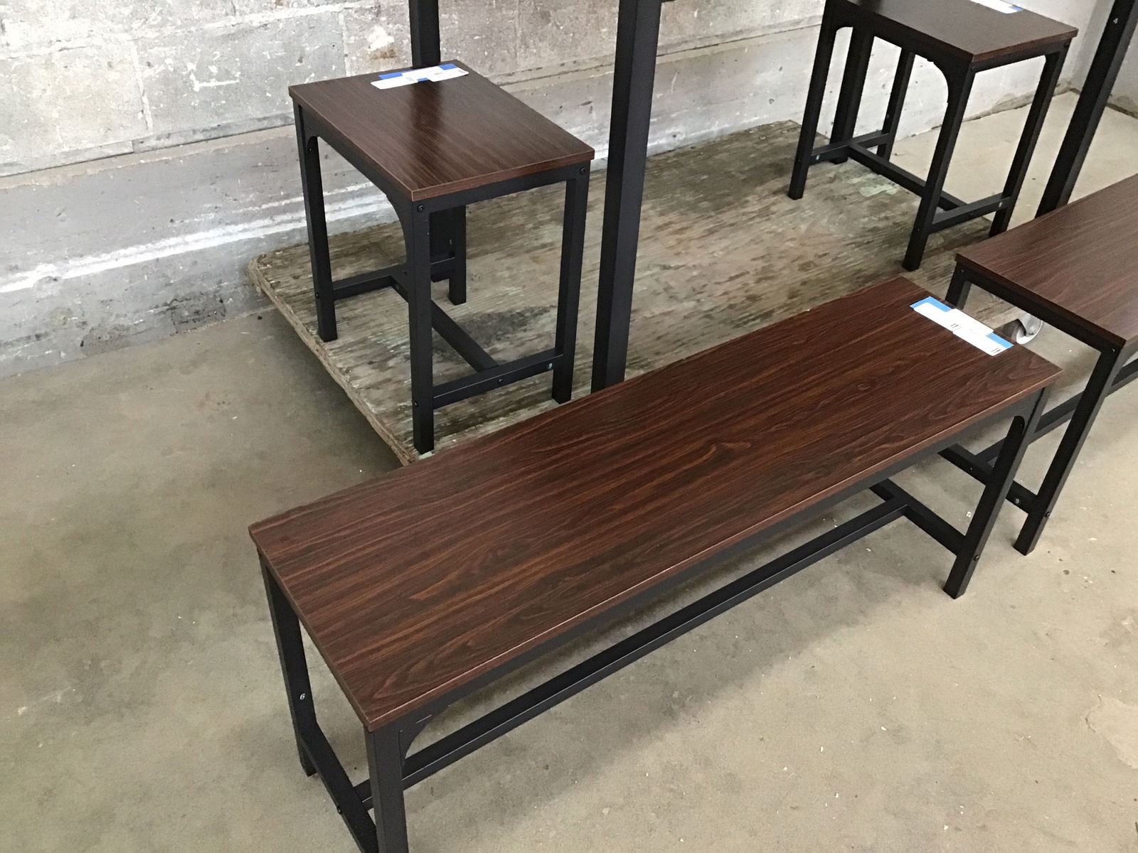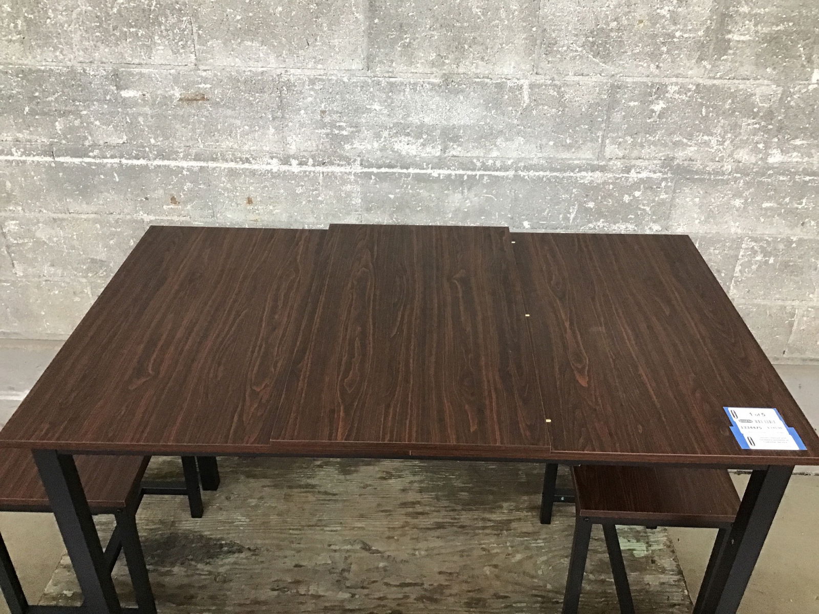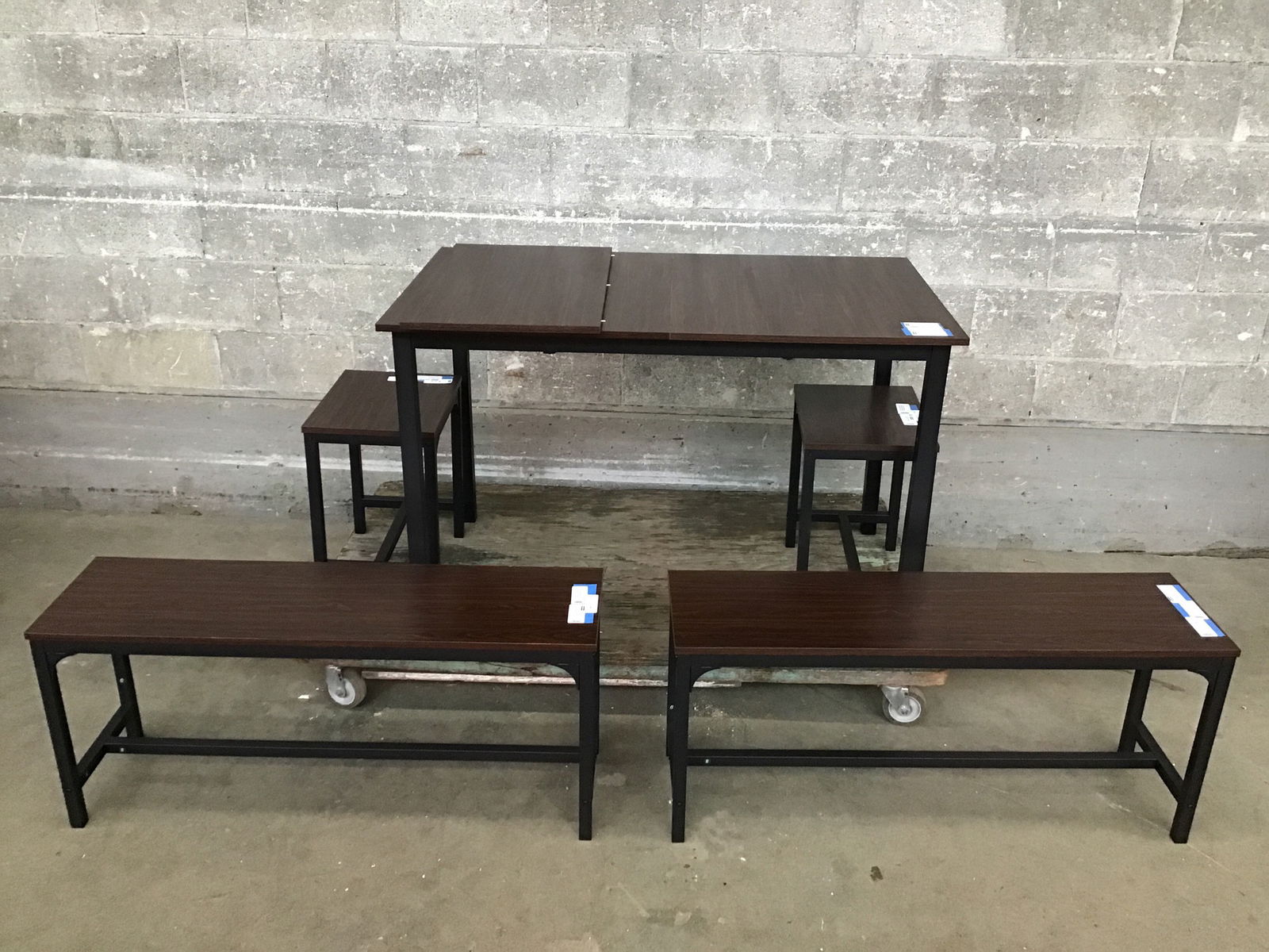 From the Amazon catalog, this light duty five piece dining set is perfect for its compact size and ample seating opportunities. Base is constructed from lightweight steel, top is faux wood laminate. Overall the whole set is clean and basically brand new as it was used recently to stage a home. Sold as a set. See it retailing on the 'zons here.