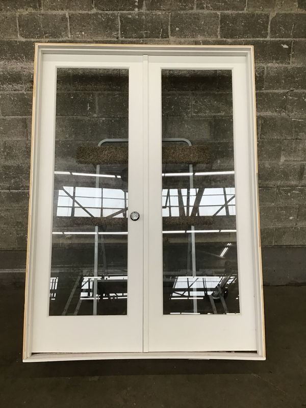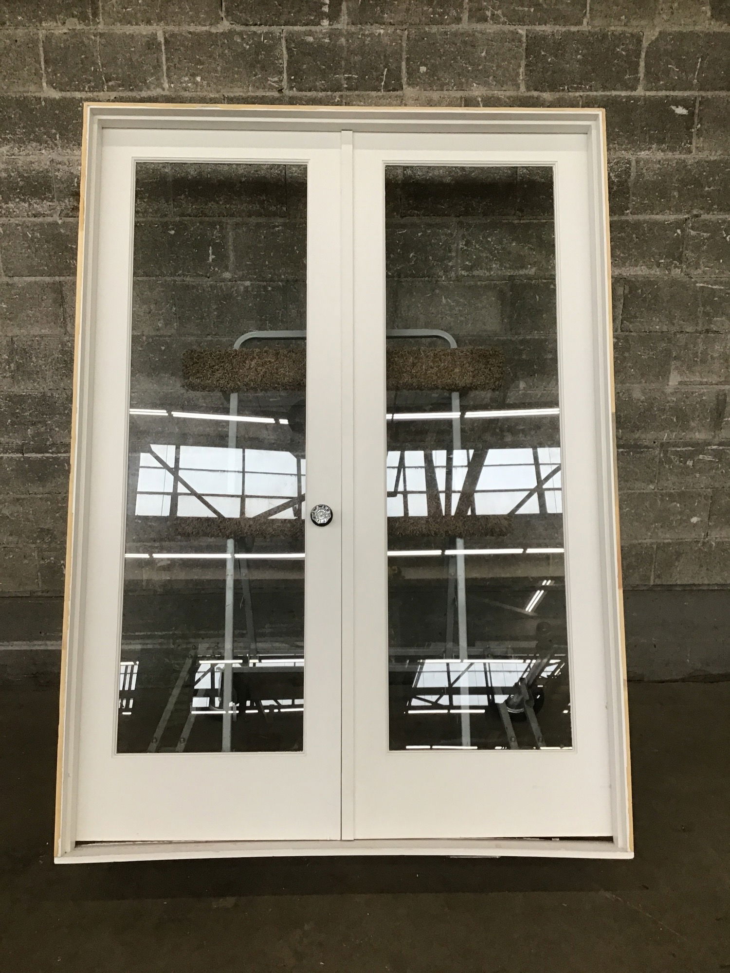 Nice looking pair of full lite double doors, painted white on both sides with reproduction glass knobs. Slightly overheight with a wide enough bottom rail that you could trim them down a skosh.