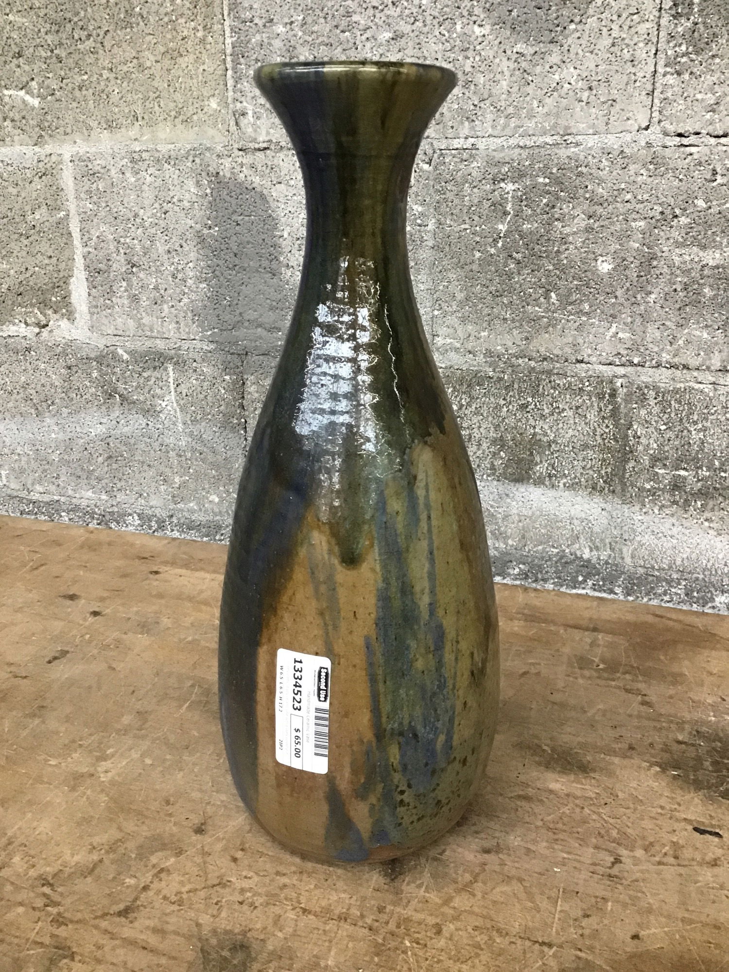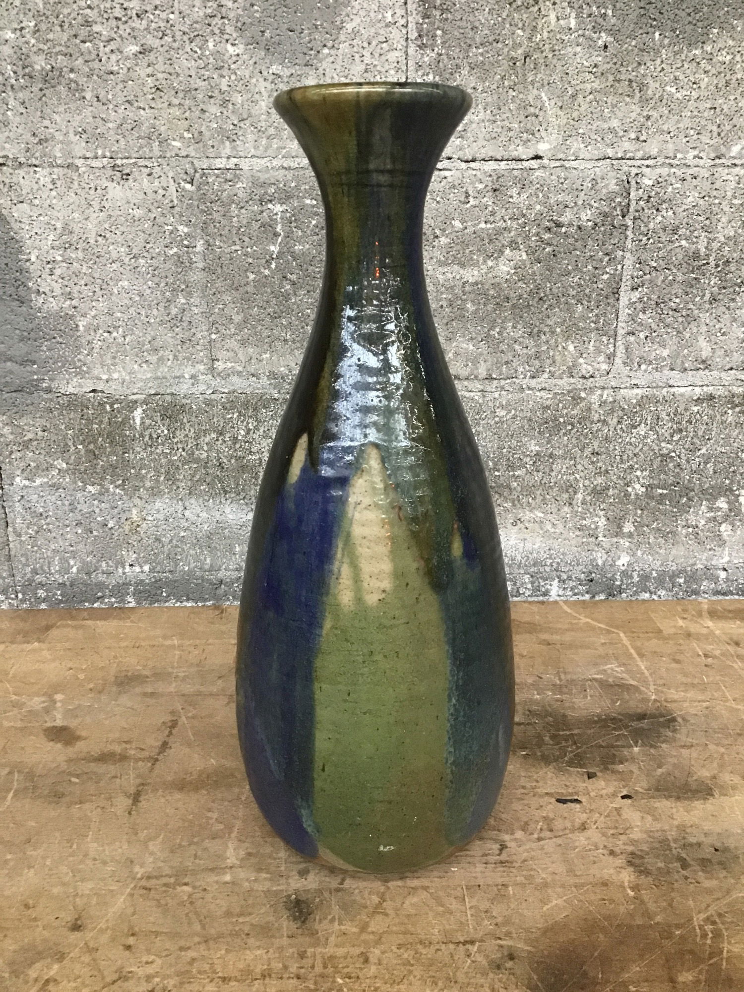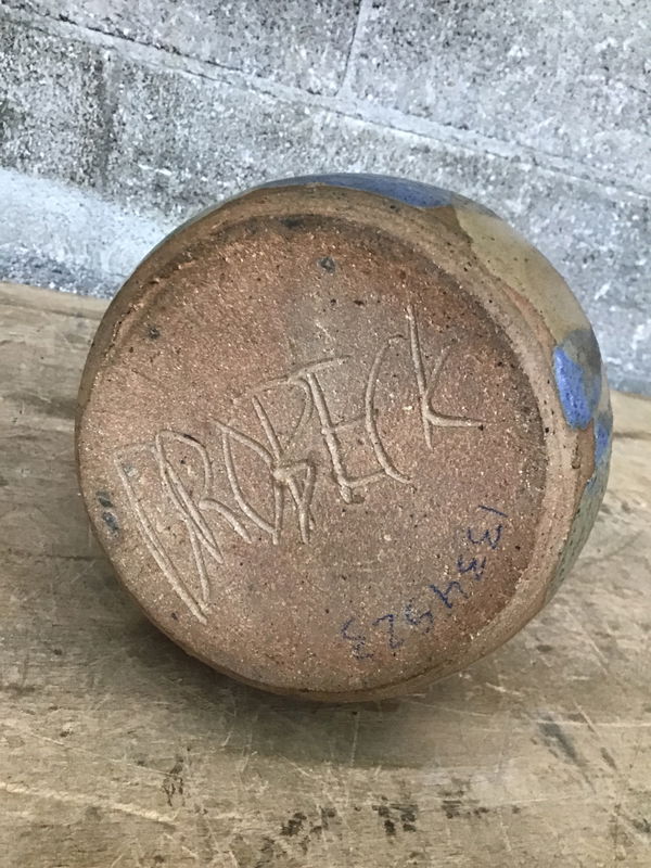 Very pretty, drippy ceramic vase with a lovely curved profile and blocks of muted blues, browns, and greens all over. Was thrown by hand and signed "Brobeck" on the bottom. This baby is heavy and well-made; will not be knocked over easily. Throw some flowers in it and marvel at its charm!