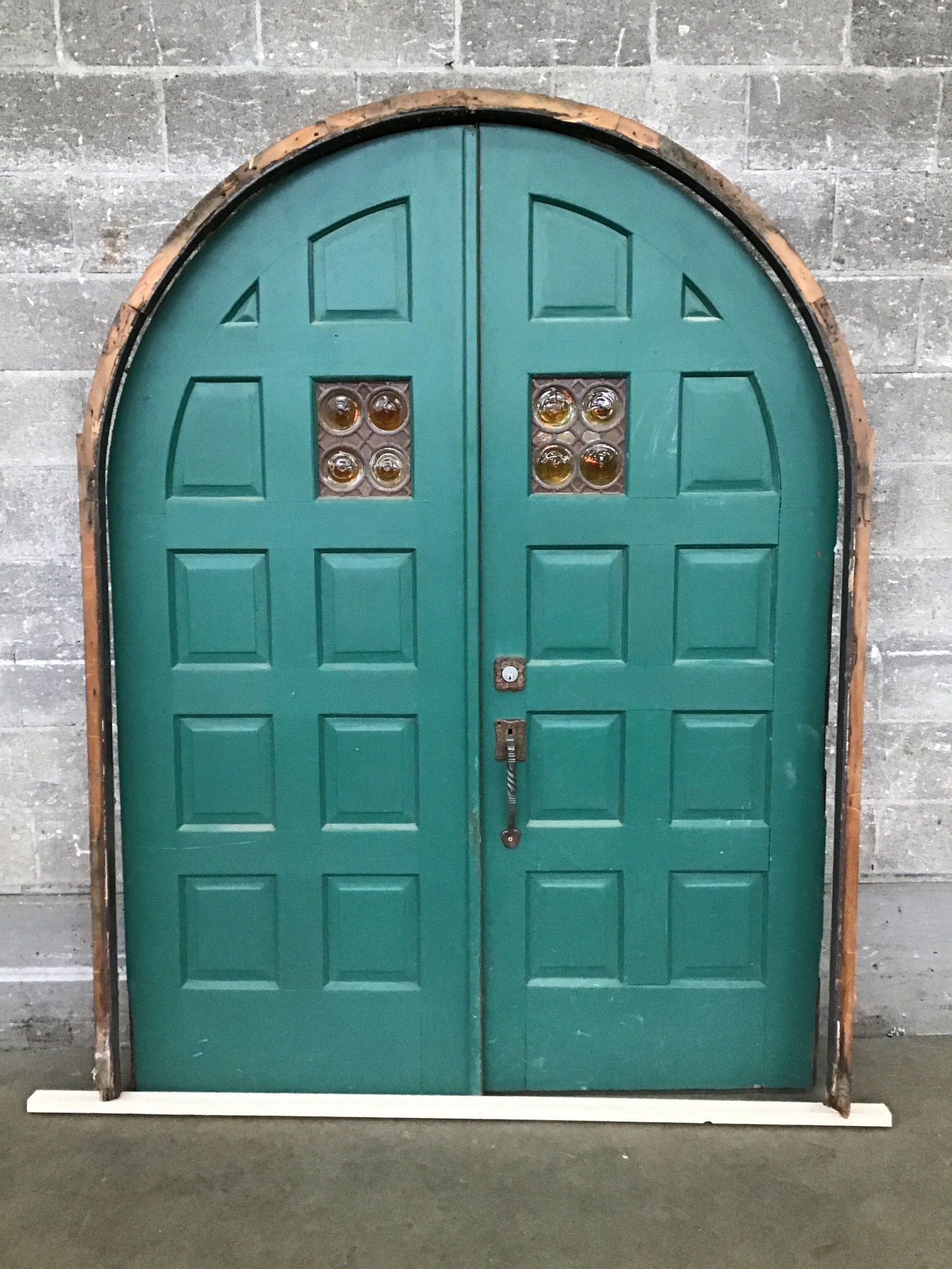 This is a bold 62" archtop exterior door with 10 panels on each door, one of which is a groovy, lead divided amber glass panel. The door has vintage wrought iron style hardware, the static door has wrought iron slide locks on the top and bottom. Exterior has a coat of teal green paint and the interior has a dark stain. Comes with original hinges and some of the original hinge screws. This door is J-stripped, price reflects.