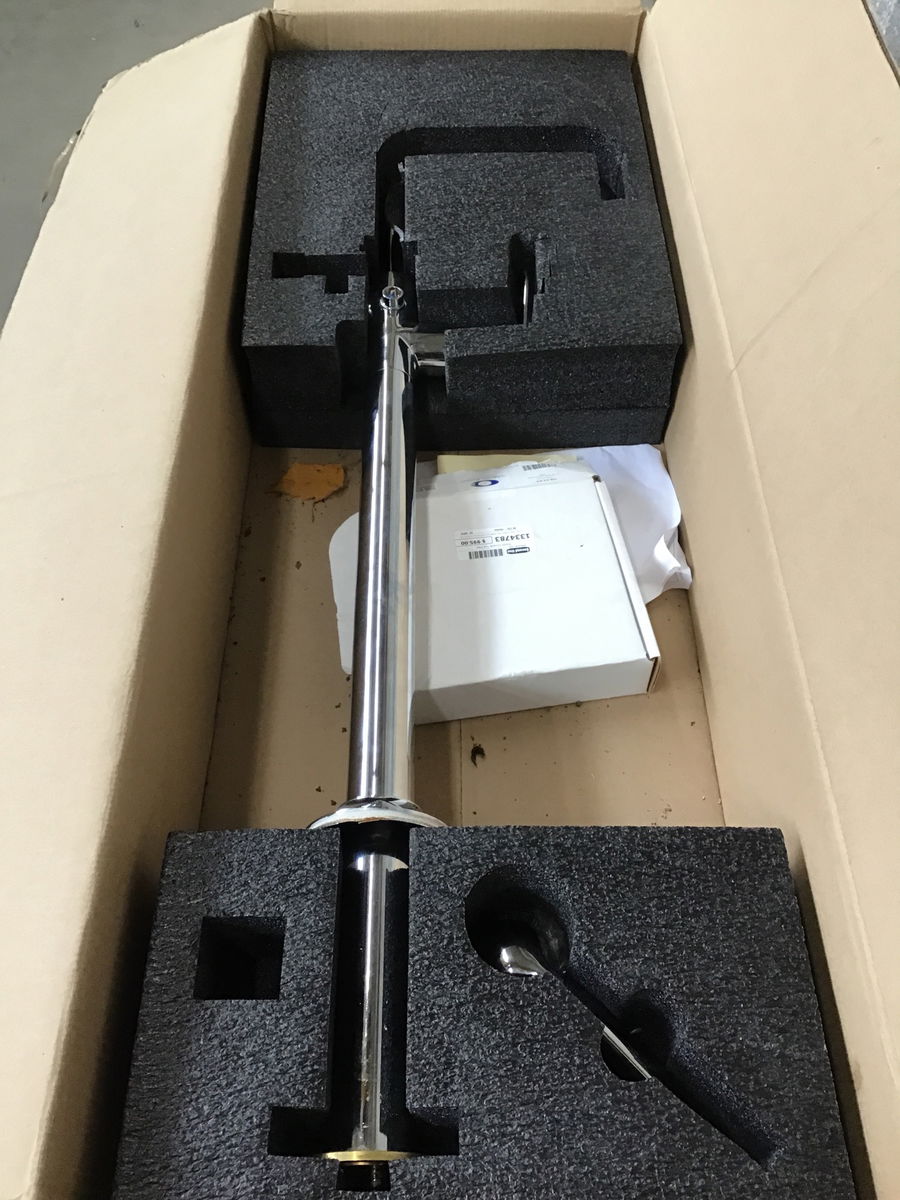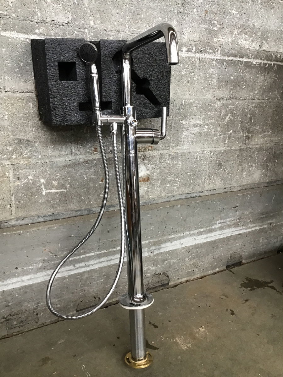 Do you have a sleek new vessel tub and no way to fill it? Well, that problem is about to disappear! This polished chrome tub filler by California Faucets mounts to the floor and has a 38" rise so that even the deepest, most luxurious tubs can be filled. It comes with a matching hand shower and minimal signs of use. Truly, aside from the mastic around the mounting flange and a few surface scratches that I had to search for it looks brand new. California Faucets tub fillers typically retail for upwards of $2500, so if you can live with some minor flaws this is a heck of a deal on a high quality fixture.