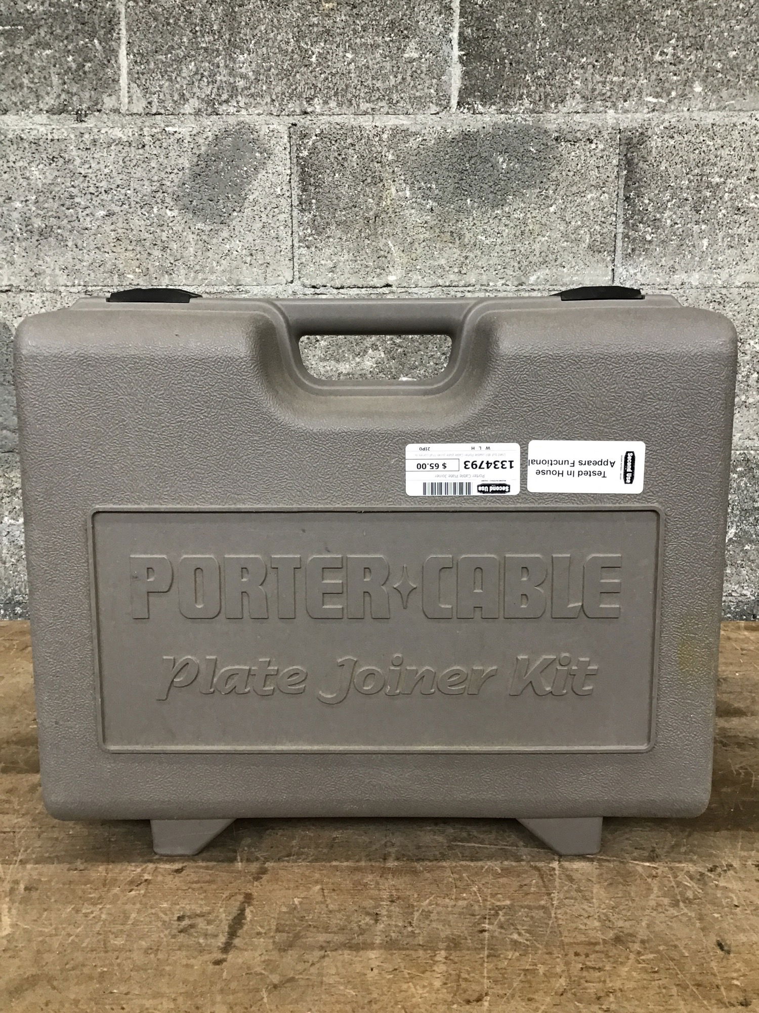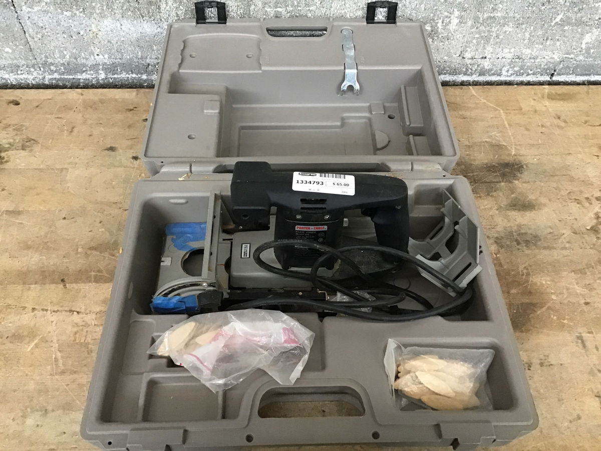 Used but still usable Porter Cable plate joiner that comes with a plastic case and a few biscuits. This appeared to be running fine when tested in house.