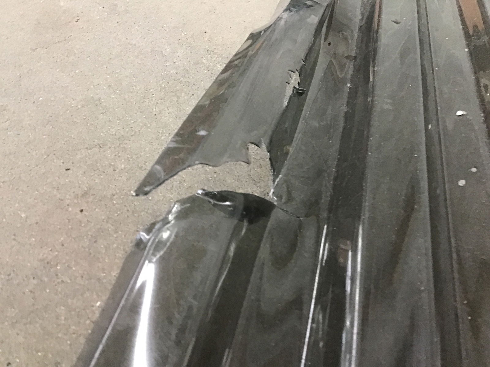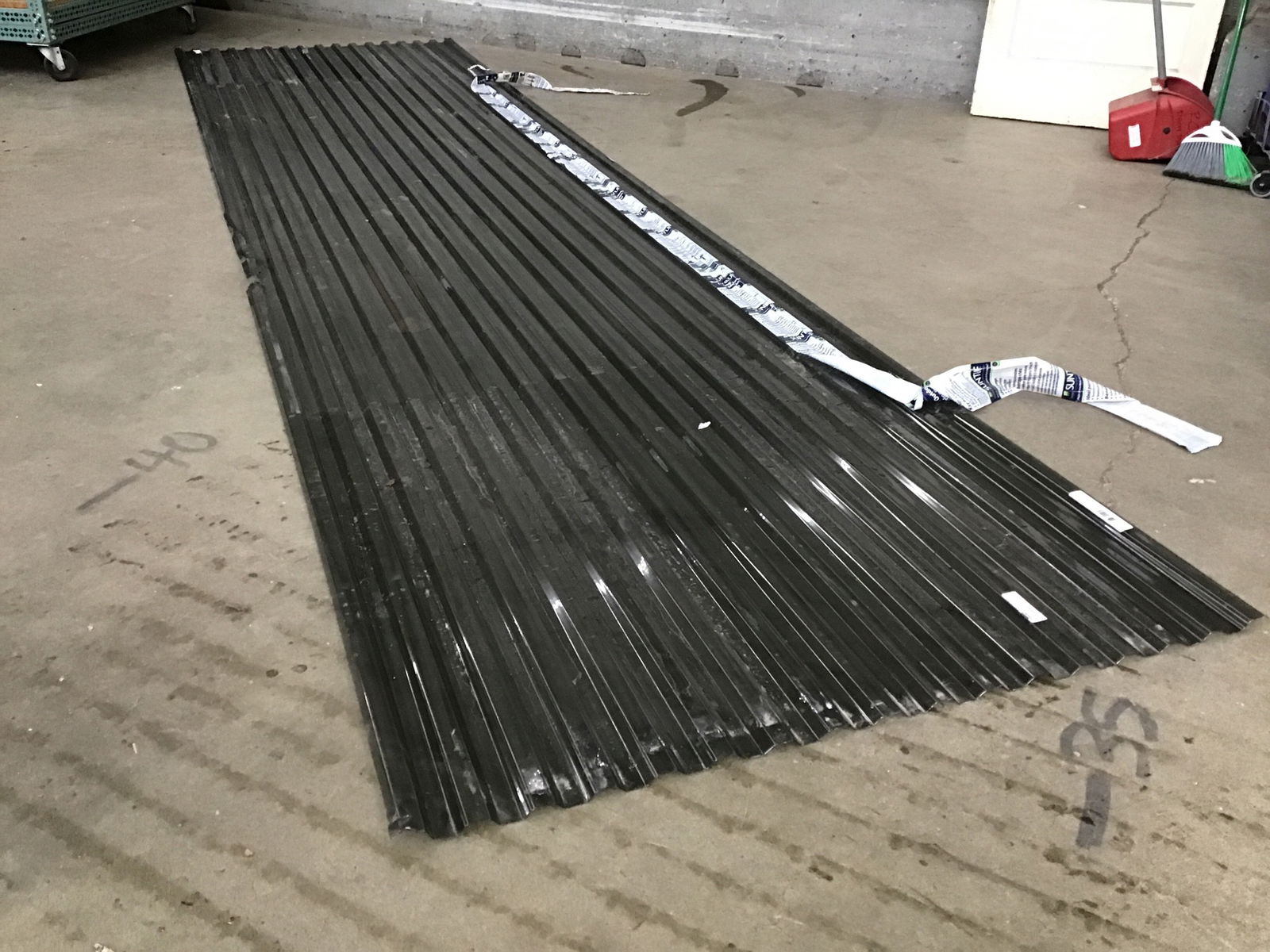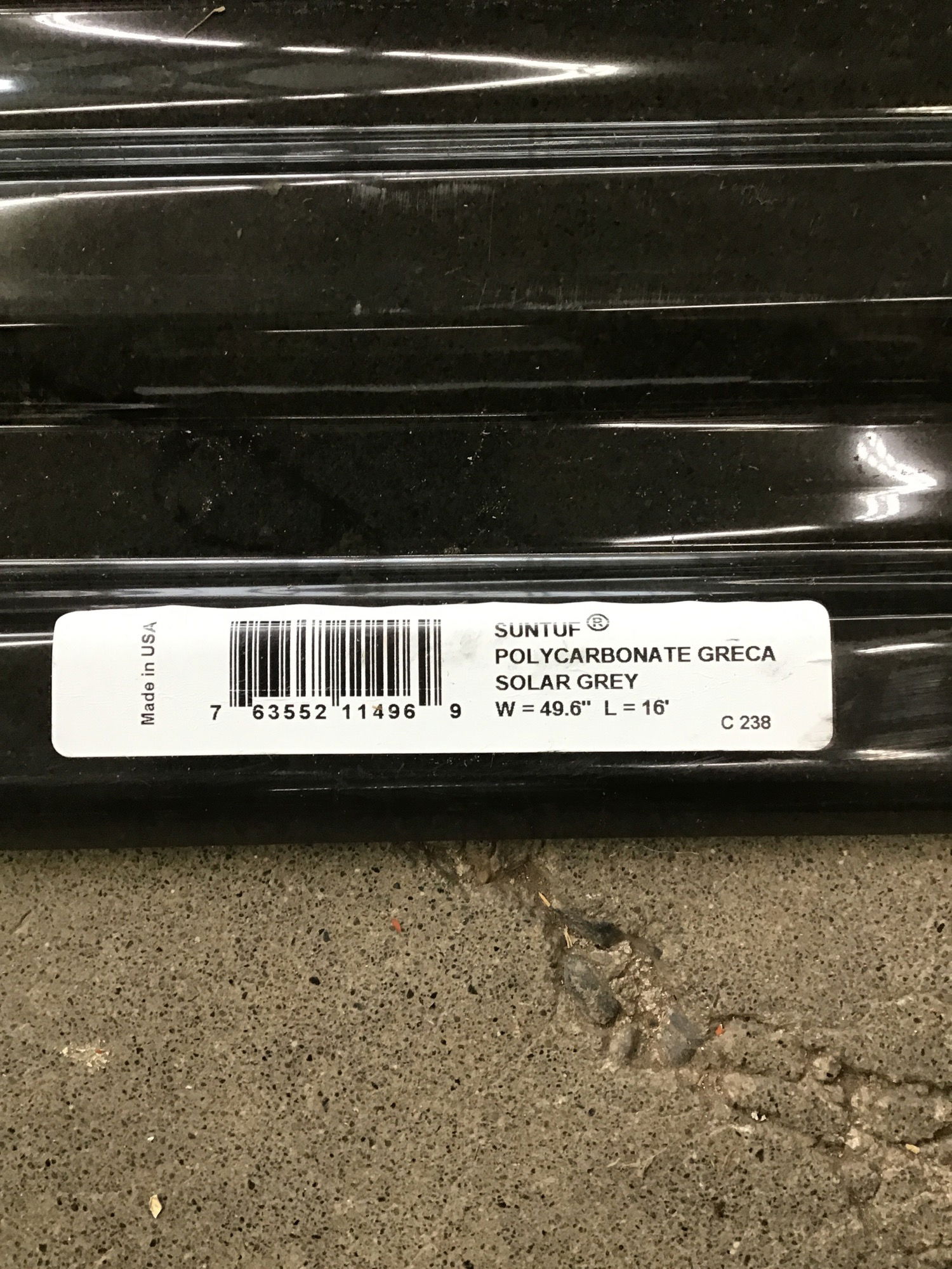 Sheet of "Solar Grey" polycarbonate greca from Suntuf corrugated roofing material. We got it because it has a blemish of some type, but it's a buck as square foot rather than $1.50 at HD. Item may have cosmetic damage.  Photo may be representational.  This is a bulk item, so come down soon to get the best of what we have. No holds please.
