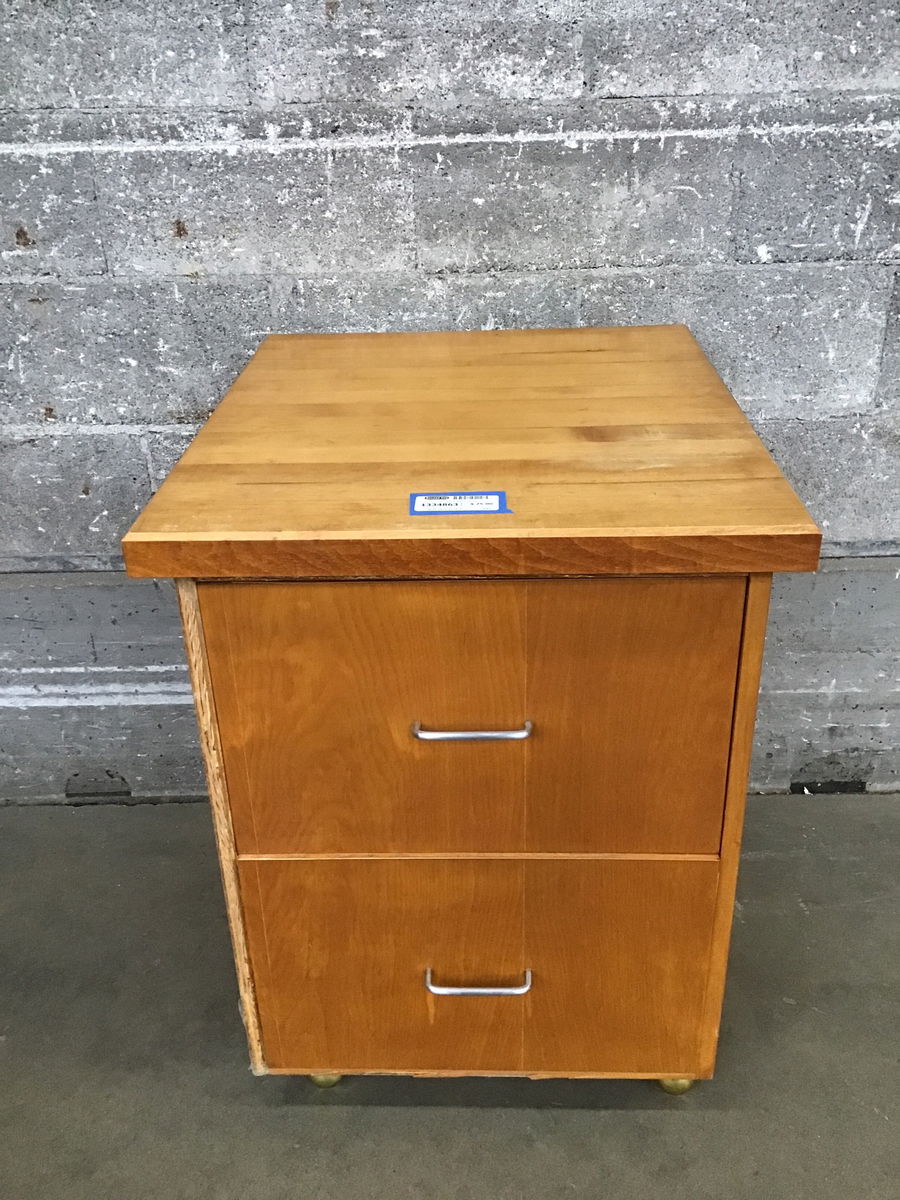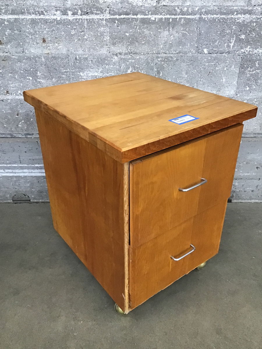 This is a stout and sturdy maple cabinet that rolls on four casters. Has two deep drawers and a solid maple top.